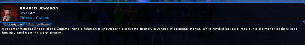 In Erin West's Arc about doing a press conference, the NPC named Arnold Johnson has a typo in his description for the word "corporate" One of the Skulls NPCs in the same mission had this line, where I believe "vigilant" should be "vigilante" given the context. Later, when telling Erin West about what you learned of her mentor's death, "politiced" should be "policies". This next one is less of a typo and more of a suggestion. In the Erin West press conference mission, one of the Skulls references Orbital Fracture by his initials OF. Given a popular website in the zeitgeist that goes by those initials, maybe it should just be spelled out in full, or another nickname given? And finally, when you meet Alpha Team, there are many inconsistencies between what a team member says and what their dossier says. Just about all of them are pointed out or referenced in one way or another, except for two instances, so I have to wonder if it is a typo. Binding Blade's dossier says their hometown is New York, but they mention being from Boulder. Whereas Radiant Dawn's dossier says he's from Boulder, but he mentions being from New York.