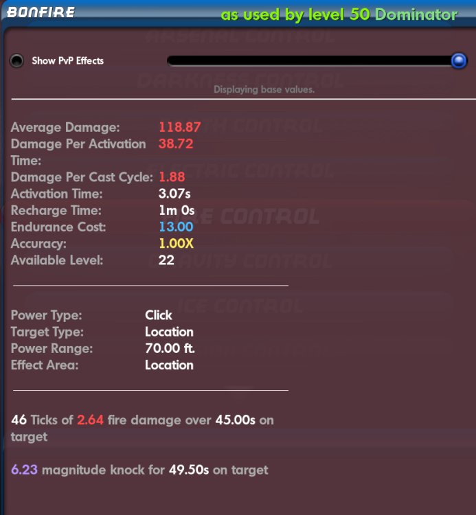 Focused Feedback: Powerset - Fire Control... replied to The Curator's topic in [Open Beta] Focused Feedback Live dominator version has the same damage value as controller. Dominator version on beta. Dominator ranged modifier is 0.95. Controller ranged modifier is 0.55. 0.95 / 0.55 = 1.73 2.64 / 1.53 = 1.73 So the goal may be that "true pseudopets" obey AT modifiers. According to City of Data, live MM bonfire matches controller beta damage per tick at 1.53. They have the same ranged damage modifier of 0.55. But I'm unsure whether or not the live MM bonfire is a "true pseudopet." According to City of Data, live Blaster bonfire damage is 2.78/tick. Blaster ranged damage modifier is 1.125 1.125 / 0.55 = 2.05 2.78 / 1.53 = 1.82 So this comparison breaks the rule, but I'm fairly certain live Blaster bonfire is not a true pseudopet, since it uses the old bonfire damage. Perhaps we'll see a buff to Blaster bonfire damage soon. Overall, I would like to request that the Devs explain what a true pseudopet is. It's a confusing, meaningless term that appears to be used for the purposes of a stealth nerf in this context. Please provide useful, clear patch notes.