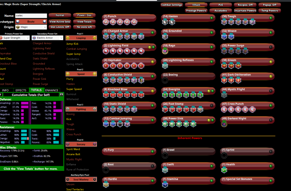 I took a different tactic- max out resistance with PS down. Capped to all but Neg, Psi (85%) and toxic. Soft Cap Melee. Can run PS or Darkest Night if times get tough or for rage crash. Capped recharge debuff resistance with ageless. Should be able to spam FS with the FF proc in foot stomp. Plan to run Musc radial, Ageless radial (for debuff resistance), and all offensive incarnates. I could cap PSI if I was willing to give up ST DPS. Should run 400+ with all incarnates. sselec - Villain Brute Build plan made with Mids Reborn v3.7.14 rev. 3 ────────────────────────────── Primary powerset: Super StrengthSecondary powerset: Electric ArmorPool powerset (#1): LeapingPool powerset (#2): SpeedPool powerset (#3): FightingPool powerset (#4): SorceryAncillary powerset: Soul Mastery ────────────────────────────── Powers taken: Level 1: Punch A: Superior Blistering Cold: Damage/Endurance/Accuracy/RechargeTime46: Superior Blistering Cold: Accuracy/Damage46: Superior Blistering Cold: Damage/Endurance50: Superior Blistering Cold: Accuracy/Damage/Endurance50: Superior Blistering Cold: Accuracy/Damage/Recharge Level 1: Charged Armor A: Unbreakable Guard: Resistance43: Unbreakable Guard: Resistance/Endurance45: Unbreakable Guard: RechargeTime/Resistance45: Unbreakable Guard: Resistance/Endurance/RechargeTime45: Aegis: Psionic/Status Resistance46: Impervium Armor: Psionic Resistance Level 2: Lightning Field A: Superior Brute's Fury: Recharge/Fury Bonus3: Superior Brute's Fury: Accuracy/Damage/Endurance/Recharge3: Superior Brute's Fury: Accuracy/Damage42: Superior Brute's Fury: Damage/Recharge43: Superior Brute's Fury: Accuracy/Damage/Recharge43: Superior Brute's Fury: Damage/Endurance/RechargeTime Level 4: Haymaker A: Superior Unrelenting Fury: RechargeTime/+Regen/+End5: Superior Unrelenting Fury: Accuracy/Damage/Endurance/RechargeTime5: Superior Unrelenting Fury: Accuracy/Damage40: Superior Unrelenting Fury: Damage/RechargeTime40: Superior Unrelenting Fury: Accuracy/Damage/RechargeTime40: Superior Unrelenting Fury: Damage/Endurance/RechargeTime Level 6: Conductive Shield A: Unbreakable Guard: Resistance7: Unbreakable Guard: Resistance/Endurance7: Unbreakable Guard: RechargeTime/Resistance21: Unbreakable Guard: Resistance/Endurance/RechargeTime23: Impervium Armor: Psionic Resistance23: Gladiator's Armor: TP Protection +3% Def (All) Level 8: Knockout Blow A: Hecatomb: Chance of Damage(Negative)9: Hecatomb: Damage/Endurance9: Hecatomb: Damage19: Hecatomb: Damage/Recharge19: Hecatomb: Damage/Recharge/Accuracy21: Hecatomb: Recharge/Accuracy Level 10: Static Shield A: Unbreakable Guard: Resistance11: Unbreakable Guard: Resistance/Endurance11: Unbreakable Guard: RechargeTime/Resistance17: Unbreakable Guard: Resistance/Endurance/RechargeTime17: Impervium Armor: Psionic Resistance Level 12: Combat Jumping A: Luck of the Gambler: Defense/Increased Global Recharge Speed13: Luck of the Gambler: Defense13: Shield Wall: +Res (Teleportation), +5% Res (All)15: Reactive Defenses: Scaling Resist Damage Level 14: Hasten A: Invention: Recharge Reduction15: Invention: Recharge Reduction Level 16: Grounded A: Steadfast Protection: Resistance/+Def 3% Level 18: Rage A: Membrane Exposure Level 20: Lightning Reflexes A: Invention: Run Speed Level 22: Boxing (Empty) Level 24: Energize A: Panacea: +Hit Points/Endurance25: Panacea: Heal25: Panacea: Heal/Endurance37: Panacea: Endurance/Recharge37: Panacea: Heal/Recharge39: Panacea: Heal/Endurance/Recharge Level 26: Foot Stomp A: Armageddon: Chance for Fire Damage27: Armageddon: Damage/Endurance27: Armageddon: Damage/Recharge34: Armageddon: Damage/Recharge/Accuracy34: Armageddon: Recharge/Accuracy37: Force Feedback: Chance for +Recharge Level 28: Power Sink A: Preventive Medicine: Chance for +Absorb29: Preventive Medicine: Heal/RechargeTime/Endurance29: Preventive Medicine: Heal33: Preventive Medicine: Endurance/RechargeTime34: Preventive Medicine: Heal/RechargeTime Level 30: Tough A: Unbreakable Guard: Resistance31: Unbreakable Guard: Resistance/Endurance31: Unbreakable Guard: RechargeTime/Resistance31: Unbreakable Guard: Resistance/Endurance/RechargeTime33: Impervium Armor: Psionic Resistance Level 32: Weave A: Luck of the Gambler: Defense/Increased Global Recharge Speed33: Luck of the Gambler: Defense Level 35: Power Surge A: Unbreakable Guard: +Max HP36: Unbreakable Guard: Resistance36: Unbreakable Guard: Endurance/RechargeTime36: Unbreakable Guard: RechargeTime/Resistance Level 38: Gloom A: Apocalypse: Chance of Damage(Negative)39: Apocalypse: Damage/Recharge/Accuracy39: Apocalypse: Damage Level 41: Dark Obliteration A: Bombardment: Chance for Fire Damage42: Bombardment: Accuracy/Damage/Recharge42: Bombardment: Damage Level 44: Mystic Flight A: Winter's Gift: Slow Resistance (20%) Level 47: Cross Punch A: Superior Avalanche: Accuracy/Damage/Endurance/Recharge48: Superior Avalanche: Accuracy/Damage48: Superior Avalanche: Accuracy/Damage/Endurance48: Superior Avalanche: Damage/Endurance50: Superior Avalanche: Accuracy/Damage/Recharge Level 49: Darkest Night A: Enzyme Exposure ────────────────────────────── Inherents: Level 1: Special Set Bonuses Level 1: Brawl (Empty) Level 1: Fury Level 1: Sprint (Empty) Level 2: Rest (Empty) Level 1: Swift A: Invention: Run Speed Level 1: Health A: Numina's Convalesence: +Regeneration/+Recovery Level 1: Hurdle A: Invention: Jumping Level 1: Stamina A: Invention: Endurance Modification Level 44: Translocation