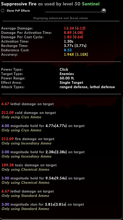 2. Hi - I think the damage for Suppressive fire is wrong for the Sentinel when using Standard Ammo - it only does 6.67 damage when the other damage types do 212.09 (apart from Chemical - which does 109.38 damage). I am sure that this is something wrong with the power itself - rather than anything to do with my individual characters - Is this something that is known will be rectified soon? Many Thanks