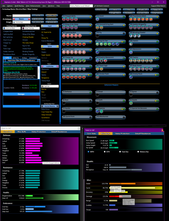 1. Howdy all. I played this game back before Going Rogue, around the time CoV came out, and I was not a gamer. Or at least, I was not a matured gamer - so I didn't ever realize there was so much you could do with enhancements. That said, I've been playing for a couple of weeks now here, and after failing fast on a couple characters (but mostly trying different powersets to see what I like) I settled on really loving me some Blasters and actually falling in love with /NinjaTraining and /MartialCombat. But I'm still struggling with a build that works because I don't really fully understand the endgame yet, either. Just to note, I did actually grind out a spines/fire brute that is now veteran level 3 - the only thing she does is fire farming and I've got some okay capital from doing about 30m-1hr of farming a day for the last two weeks or so at +4/x8. So yes, I know this stuff will hurt my influence-account, and some of these I don't even know how to get yet (blaster sets) but I wanted something to aim/save/start plugging enhs for as I level this one with my waifu. If anyone has suggestions for what I could sub out for certain sets, I'm all ears. Edit: Wanted to mention, I know it's probably going to be end-heavy. That's why I slotted 3 of the Chance for +End. Charged Bolts is a fast recharge, and with tempest slotted, I'm hoping between the procs I can keep things running smoothly. However, I anticipate that as I hit 30-40, things will get reallllly wonky and tough without taking 10 end inspirations with me, so if there's something I could do to address that, I'm all ears there too. Oh and, if you wouldn't mind - just at the top of your post, for the sake of my OCD, just give me a "(#) out of 10" or "(#)/10" so my dumb ocd brain can be satisfied. # **Hero Blaster** ### *Build plan made with Mids Reborn v3.7.14 rev. 3* Character concept: Zapninja - Static shock meets batman. Powers: Electric Blast and Ninja Training Goals: Solo/Duo PvE Content (partner being Demons/Thermal Radiation MM or Storm/Storm Corruptor) Playstyle: Find pack of mobs. Run in -> Short circuit/Ball lightning to build static. Tesla cage on LTs/Bosses. Pop smoke and Dragonfly into Thunderous Blast, then pick them off with Lightning/Charged Bolts. For single target/bosses, it's much the same - except stealth open (hopefully crit) with Dragonfly, Tesla Cage, and into Thunderous Blast then just smashing buttons. ---- - **Primary powerset: Electrical Blast** - **Secondary powerset: Ninja Training** - **Pool powerset (#1): Flight** - **Pool powerset (#2): Speed** - **Pool powerset (#3): Leadership** - **Pool powerset (#4): Fighting** - **Epic powerset: Arsenal Mastery** ---- # **Powers taken:** ---- # **Inherents:** ---- # **Stats Breakdown:** ---- # **Set Effects Breakdown** ---- # **Set Buffs Totals**