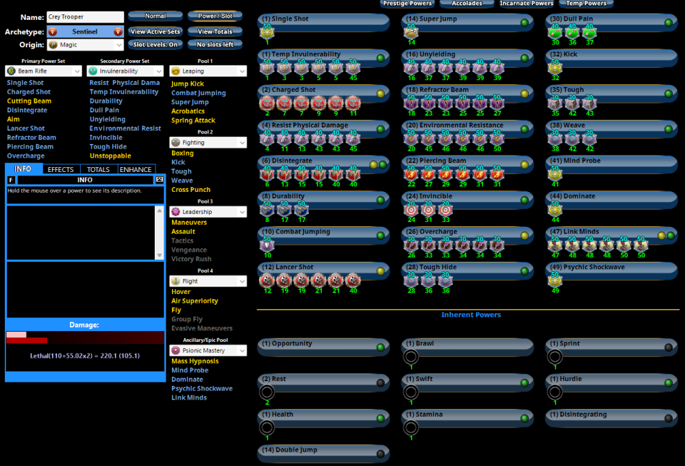 6. Hey all, trying to build a decent BS/WP Scrapper. The only problem is I am terrible at crafting builds. My character concept is "Paladin". So I have heals skills picked to fit the theme. Please take a look and let me know what I can do to improve this build. I am level 23 currently and have had zero issues playing solo or in groups, but would definitely like to maximize what I can out of this character. Thanks!! Hero Plan by Mids' Hero Designer 1.96 http://www.cohplanner.com/ Click this DataLink to open the build! Paladin: Level 50 Magic Scrapper Primary Power Set: Broad Sword Secondary Power Set: Willpower Power Pool: Medicine Power Pool: Leaping Power Pool: Fighting Hero Profile: Level 1: Slash (A) Accuracy IO (3) Damage Increase IO (7) Damage Increase IO (11) Damage Increase IO (17) Endurance Reduction IO (23) Recharge Reduction IO Level 1: High Pain Tolerance (A) Resist Damage IO (5) Resist Damage IO (36) Resist Damage IO (37) Healing IO (37) Healing IO (37) Healing IO Level 2: Slice (A) Accuracy IO (3) Damage Increase IO (7) Damage Increase IO (11) Damage Increase IO (15) Endurance Reduction IO (17) Recharge Reduction IO Level 4: Fast Healing (A) Healing IO (5) Healing IO (15) Healing IO Level 6: Aid Other (A) Healing IO Level 8: Mind Over Body (A) Resist Damage IO (9) Resist Damage IO (9) Resist Damage IO (39) Endurance Reduction IO (40) Endurance Reduction IO (40) Endurance Reduction IO Level 10: Super Jump (A) Jumping IO Level 12: Indomitable Will (A) Defense Buff IO (13) Defense Buff IO (13) Defense Buff IO (40) Endurance Reduction IO (42) Endurance Reduction IO (42) Endurance Reduction IO Level 14: Aid Self (A) Healing IO Level 16: Rise to the Challenge (A) To Hit Debuff IO (42) Endurance Reduction IO (43) Endurance Reduction IO (43) Healing IO (43) Healing IO (45) To Hit Debuff IO Level 18: Whirling Sword (A) Accuracy IO (19) Damage Increase IO (19) Damage Increase IO (23) Damage Increase IO (50) Endurance Reduction IO (50) Recharge Reduction IO Level 20: Quick Recovery (A) Endurance Modification IO (21) Endurance Modification IO (21) Endurance Modification IO Level 22: Kick (A) Accuracy IO Level 24: Tough (A) Resist Damage IO (25) Resist Damage IO (25) Resist Damage IO Level 26: Disembowel (A) Accuracy IO (27) Damage Increase IO (27) Damage Increase IO (31) Damage Increase IO (33) Endurance Reduction IO (50) Recharge Reduction IO Level 28: Heightened Senses (A) Defense Buff IO (29) Defense Buff IO (29) Defense Buff IO (45) Endurance Reduction IO (45) Endurance Reduction IO (46) Endurance Reduction IO Level 30: Weave (A) Defense Buff IO (31) Defense Buff IO (31) Defense Buff IO Level 32: Head Splitter (A) Accuracy IO (33) Damage Increase IO (33) Damage Increase IO (34) Damage Increase IO (34) Endurance Reduction IO (34) Recharge Reduction IO Level 35: Resurgence (A) Recharge Reduction IO (36) Recharge Reduction IO (36) Recharge Reduction IO Level 38: Strength of Will (A) Resist Damage IO (39) Resist Damage IO (39) Resist Damage IO (46) Endurance Reduction IO (46) Endurance Reduction IO (48) Endurance Reduction IO Level 41: Resuscitate (A) Recharge Reduction IO Level 44: Parry (A) Accuracy IO Level 47: Build Up (A) Recharge Reduction IO (48) Recharge Reduction IO (48) Recharge Reduction IO Level 49: Combat Jumping (A) Defense Buff Level 1: Brawl (A) Empty Level 1: Critical Hit Level 1: Prestige Power Dash (A) Empty Level 1: Prestige Power Slide (A) Empty Level 1: Prestige Power Quick (A) Empty Level 1: Prestige Power Rush (A) Empty Level 1: Prestige Power Surge (A) Empty Level 1: Sprint (A) Empty Level 2: Rest (A) Empty Level 4: Ninja Run Level 2: Swift (A) Empty Level 2: Health (A) Healing IO Level 2: Hurdle (A) Empty Level 2: Stamina (A) Endurance Modification IO ------------ ------------ Set Bonus Totals: ------------ Set Bonuses: