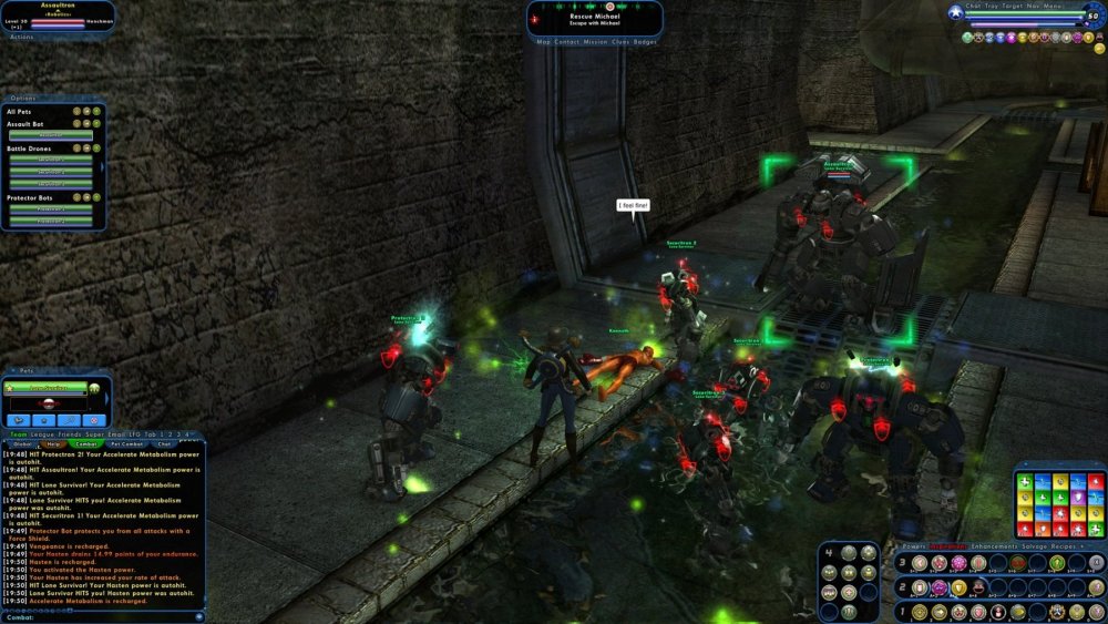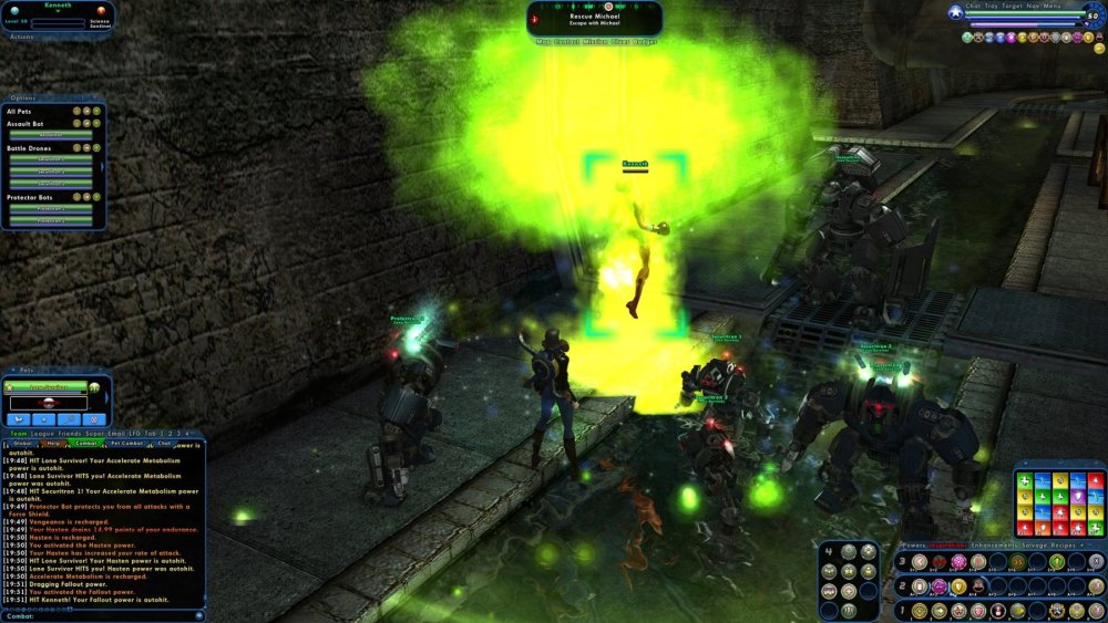 Foreword: This is an RP build that is decent in most content but not thoroughly tested. Technically, any Archetype with Radiation Emission can work for it. I personally just chose a Bots/Rad MM. Other flavorful concepts might be Punks/Rad, AR or Beam on an AT with a blast set, or maybe Arsenal/Rad on a Controller. Lots of room in the concept space. Thanks to @biostem for the costume inspiration! I went with a Tunnel Snakes vibe with a porter-pack as this build makes extensive use of the Teleport pool. Overseer: Enclave? Brotherhood of what? You must have hit your head pretty hard out there, vault dweller. It was a stroke of Luck these RobCo robots found you and activated your Mediporter. No, they don't look any different to me. This is how the models produced here in Paragon City have always looked. You must be thinking of somewhere else. Oh, and there's someone... Or maybe something else. The bots found this... Person? Dead beside you. At least their high quality, perfectly reliable programming thought it was dead. (Brought to you by RobCo.) But it keeps insisting it's not dead so they brought it here with you. You: [Oh, that's Kenneth. He's a feral ghoul. Long story but he's mostly harmless. And incredibly useful. Say hi, Kenneth.] Overseer: Mostly harmless? Well, if you think he can help with your mission then I'll trust your judgement. Since you hit your head, I'll remind you, you're looking for a water chip. It's probably a glowing box or wall safe making a humming sound in the back of a warehouse, office building or sewer. You: [Why?] Overseer: Why is it glowing and making noise? Easier to find that way, I suppose. That's just how we've always done it. You: [No, why a water chip?] Overseer: You've seen what's out there so you'd know better than me why we need as much water filtration as we can get. Aliens, mutants, magicians, scientists like yourself, all putting who-knows-what in the water. You: [Ok, but why me?] Overseer: Because I told you to. I'm the Overseer and I'm a very busy man. Now, I'm heading back to my office. The nurses here will take care of you. Good luck out there! [End Dialog] This is a bots/rad duo roleplay build that relies on having either a friend who wants to soak XP and not actually play the game or, much more likely, your own multi box account teammate. Be aware of and follow the multi box rules. It's meant for RP and soloing (duoing?) but there's no reason the Mastermind build wouldn't work on any casual team or league. You could also sub out Kenneth for the kind of Blaster that has Rise of The Phoenix in their attack chain. Build-nerd things like defense numbers and accuracy assume that you have Vengeance active and perma, and use Fallout on cooldown, which was basically the inspiration behind this whole thing. Fallout is usually pretty skippable, but in this case has a huge -37.5% res debuff, along with -dam and -tohit for anything that survives. The debuffs aren't perma-able but they're great for 30 seconds every ~80. I didn't take an Incarnate Destiny in the build yet, but pretty much anything will work. Base it off your playstyle and expected content. Standouts include Clarion Radial for more debuffs and Barrier Core for survivability. You could also swap Alphas (Intuition Radial) for Musculature Radial losing slow and hold enhancement for more endmod from Accelerate Metabolism and Stamina. Choking Cloud may be controversial but I feel like the +2 Mag and +Absorb procs go off enough, and with the slotting and Alpha it has enough hold duration to be a significant source of mitigation. YMMV. You could also swap in EM Pulse, I just personally don't like it. Maybe drop either Choking Cloud or Pulse Rifle Burst so you can 6-slot it as another ultimate style power. Mutation is flavorful but we want Kenneth to stay down. Maintenance drone is a fine choice but I found it hard to fit in. Kenneth the ghoul's build is literally any Regen (for flavor) or other powerset with a self rez. His job is to die (sorry, "be defeated") and provide a target for you to haul around with teleports and use Vengeance and Fallout on, on cooldown. I named mine Kenneth because, well, they killed him again. Those bastards. How to Play: DISABLE PROMPT TEAM TELEPORT on Kenneth! Keep your minions generally in Bodyguard mode (Defensive+Follow). But have an Aggressive button for when it's safe. Usual Mastermind stuff. Use Vengeance on Kenneth on cooldown. Teleport Kenneth into the mob OR Team Teleport both of you into the mob for higher risk but faster Fold Space and Choking Cloud effectiveness. Activate at least Enervating Field for the -res. Use Radiation Infection if you need more safety. Usual Radiation stuff. Fold Space if needed. Immob them with Electrifying Fences so they don't run or get KBd. (Alternate: Use Lingering Radiation against mez-immune enemies and/or Warwolves) Fallout to live up to this crossover's namesake! By this time, your minions have opened up and you're taking return fire. Hit Radiant Aura as needed to heal. Remember that AoE healing on your Bodyguards is Super Effective for your effective hitpoints. Attack with Pulse Rifle Blast if you get a second. Usually on bosses. Use Pulse Rifle Blast and Lingering Radiation to Nerf Regen on hard targets like AVs, Monsters, etc. It really helps to have a macro or bind that targets Kenneth (Many binds present but not pictured in the following screenshots). YMMV, suit your own playstyle and setup. Have fun! Build Datachunk: Mastermind (Robotics - Radiation Emission).mbd