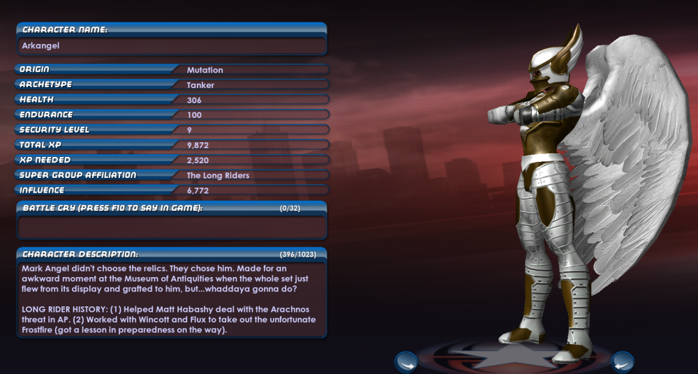 So, back to Twinshot. After working No Mind (i.e., learning the SK/Exemp system), I get this mish: And what better place to check this out than: Ahhhh...clever girl, tutorial... Finished all of Shining Stars. With the 3 merits I got there, plus 20 more from Talshak, Ark has over 100 merits. Haven't had to tap any for seed $$, but things are starting to get expensive. I've managed to slot DO's in everything, with a handful of SO's. Will probably need a deep into the pool to keep up at this point. Enjoying my little Sword/Shield dude. Bit slow on the attacks, but, now that he's gotten into the teens, his defenses are buffed up enough to stand tall against...most things (CoT...obviously a personal nemesis, considering BG...they be drainers, man). NOTE: In finishing last of Twinshot's 3 arcs, found nugget I didn't know - Det. Martins moonlights as an unregistered hero, Shadow Commando. No artwork available for him, and he doesn't seem to appear in any missions anywhere, so I may have my next AE mish idea.