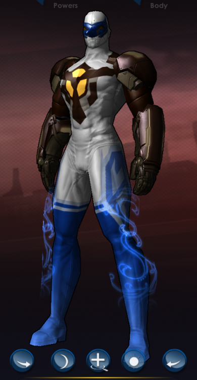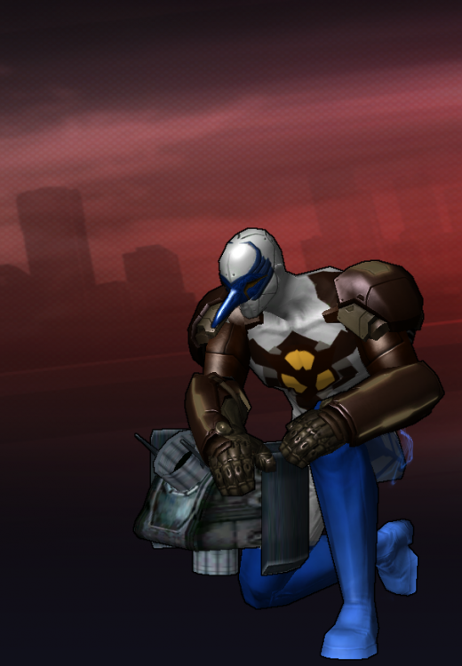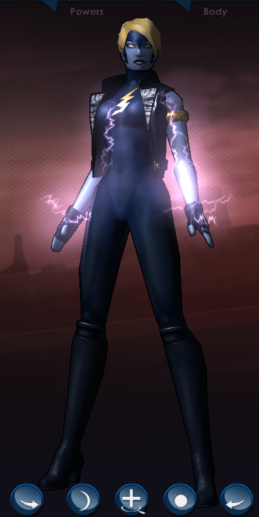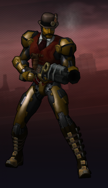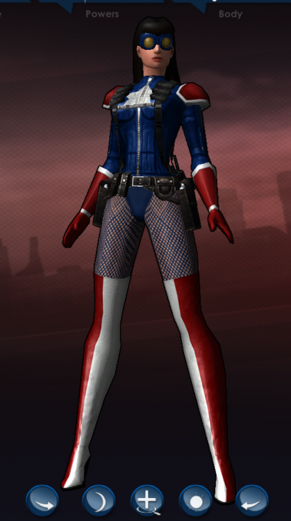 A quick attempt before bed. I think you've got a lot of good stuff in there already, mostly I just tweaked things a bit. It's a pretty good look as it is, and it doesn't need much of an overhaul. I kept a lot of elements from the original design -- the thigh-high boots, the flared gloves, the guns on her hips. That all just works. My first thought was that she needed fishnets/nylons. That says "sexy," but in particular it says it in a 1940s kind of way. The seam up the back lines up well with the seam on the boots, so I used the stripe pattern to accent that line and, you know, make her legs go all the way up, so to speak. I gave her a more dated hairstyle to hammer home the era she's representing. Overall I went for a mix of eye candy, and tactical utility inspired by the first Captain America movie (and the WWII scenes from The Ultimates). I wanted to use an "up" set of goggles, either blast or resistance, but they clipped badly with the bangs on her hair and I wanted to keep that. They're easy enough to remove if you don't like them, I'm not a hundred percent sold on them myself but I thought she needed something. Adding a cigarette might be a nice touch too (instead?), now that I think about it. For whatever reason, there's a tendency people have when creating "patriot" superheroes to use a very specific shade of blue, and it's... it's wrong, is what it is. Folks go WAY too light. If you look at a US or UK flag, the shades of blue on them are actually quite dark. Besides that, I think the darker shade helps with the whole "utilitarian" look I already mentioned. Something I think looks great with flamboyant animations like you find in the Dual Pistols set is to have something trail behind the character while they twist and spin, but capes clip weirdly with long hair and, again, I wanted to keep that, so I tried something else: I added a combat-only Fairy Dust aura on her fists. I think it creates a neat effect, with the "sparks" flying off her weapons and enhancing the motion of some of the more extreme movements. I haven't quite figured out the whole screen-record-to-.gif thing yet, but if you load up the costume file, it's in there. I'd like to try my hand at a less-showy olive drab variation too, but it's late and I'm tired, so I'll revisit this later and see what I can come up with. Hope you like! PistolPinup.costume
