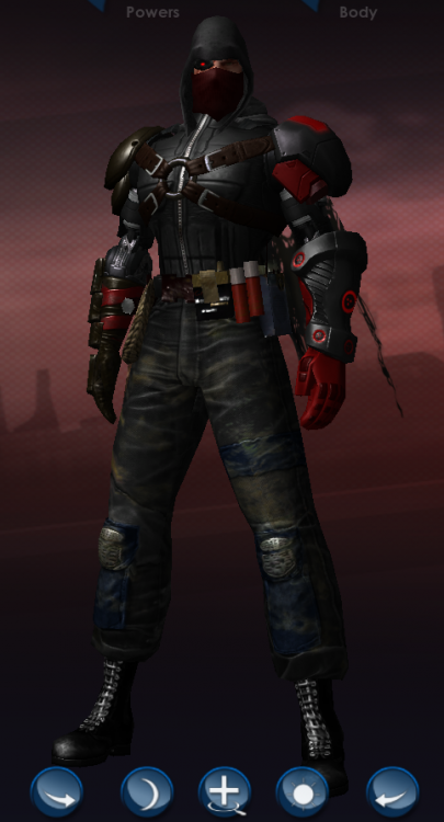 My attempt: "Resistance" in the name and this description tell me he's fighting from underneath. This isn't someone with a lot of resources, he's using whatever he can get his hands on. There's no way that cyberware isn't either stolen or secondhand. So yes, two robotic arms, but one is older, dirtier, probably cobbled together from parts of three or four other cyberarms, a huge pain to keep working properly. The other one, maybe he got lucky, took out a patrol, one of them had an arm in good shape that was compatible with his existing tech. It's nicer, but more obvious. Makes him both a symbol and a target. I also figure he'd probably like to keep his identity secret, so the mask-hood combo does that while still looking like stuff he found and repurposed rather than something he bought. I love the Post-Apocalyptic pants in general and they totally fit that overall "freedom fighter" aesthetic, so didn't see any reason to change them too much here. I do feel like he could use some torso protection, though, thus the flak jacket. ResArrow.costume