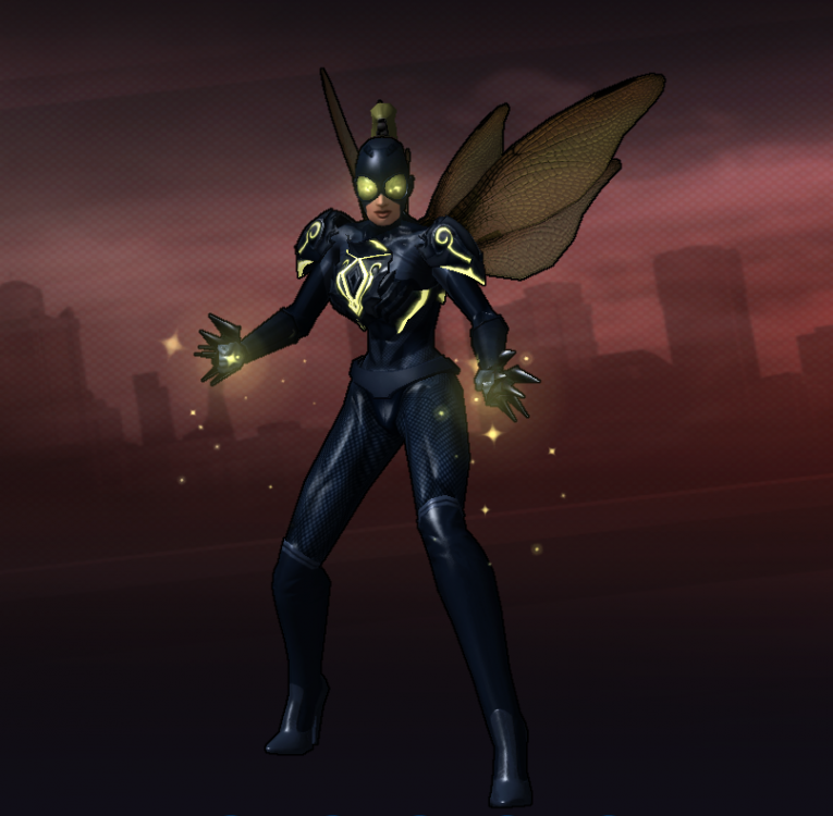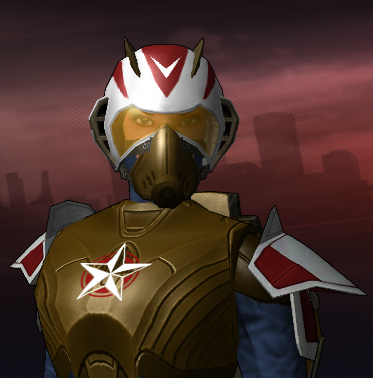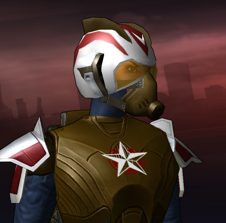 It can be tricky working with a lot of colors, but thankfully "neutral" ones like black/white/grey make things a little less complicated because they don't tend to clash with anything. Gold is slightly less problematic too, since a lot of costume pieces have non-colorable gold accents (the hem/border at the bottom of the Patrician Toga, the pattern on the Praetoria Police chest armor, the buttons on the Victorian Steampunk corset, several Imperial Dynasty chest and leg patterns for women). In my experience, it's usually best to pick one or two "main" colors and one "accent" color, though any of those being a neutral one makes it more likely that you can work in something extra, so we're actually in good shape here with black and white plus two other colors. Unfortunately, the two-colors-per-thing limitation you mentioned means that accessories like chest and shoulder pieces are almost certainly going to be needed, if only to have somewhere to put all of those colors! Ultimately, I think this may be a case of having to settle for "similar to" rather than "actually a recreation of" -- and not just for ToS/copyright reasons. The character editor can only do what it can do, and we can only work within those limits. We can either lament not having a "spiderwebs" pattern or a "power ring" hand model, or we can look at what we do have and make something out of that. I managed to put this together, not exactly what you asked for, but based somewhat on the source character. Is it Captain Avalon? Absolutely not. Does it evoke a similar "feel"? I'd like to think so. Hope it helps! Avalon.costume