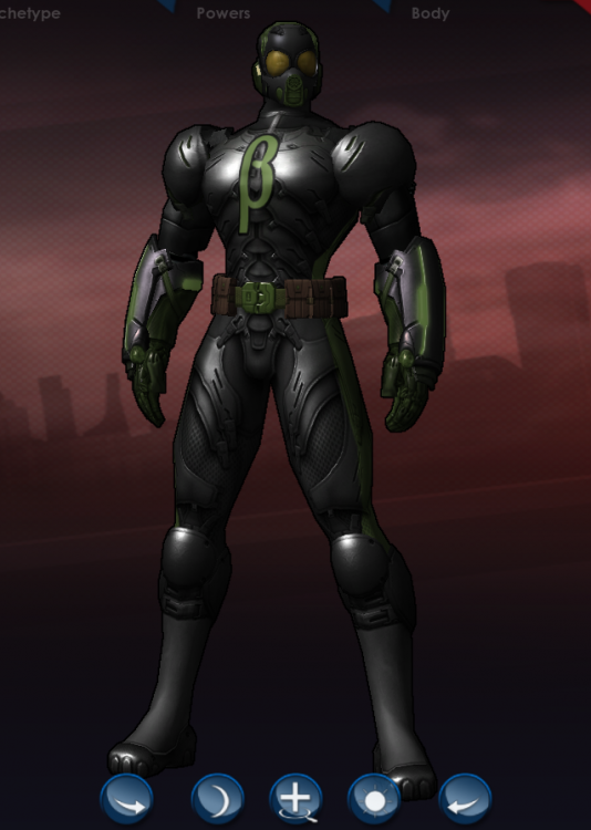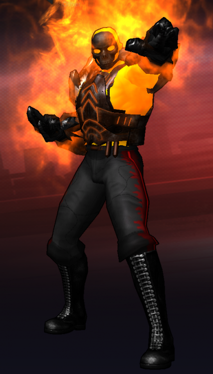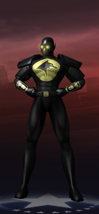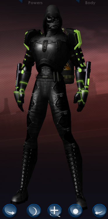 Oh, this is a fun one! I don't know how his powers are colored, but when I think "fear gas," the image in my mind is kind of a sickly yellow-green color. So I kept the tanks and tubes as requested, but colored them to match that. And then I purposely used drab colors on the rest of the design, so that his gas-distribution system is sort of a visual focal point. I made him thinner, because, well, the Scarecrow. I like the "grinning terror" aspect of the original design's face/head, so I played with it a little and came up with this. Still sort of a jack-o'-lantern, but also sort of the Grim Reaper and also sort of a clown -- terror incarnate. Screenshots won't do it justice, but I'm particularly a fan of the aura -- Volcanic eyes are pure nightmare fuel when seen in motion. It's there in the costume file, I just set it to "combat" so I could get a clear shot of the costume itself -- load it up and see what he really looks like. Speaking of auras, the costume file also includes a cloud of fear gas as a path aura, depending on your tastes. Personally, I like it, but again, didn't want it to obscure the costume-costume so I turned it off for the screenshot. If you're not a fan, Roaches might be a solid choice instead -- bugs are scary too! I played with the idea of a gas mask or respirator, but one, it would have covered his face, and two, I like the idea that he breathes in his own stuff like it's no big deal. "Yeah, fear gas, hallucinations, so what, welcome to my world." The Ampules belt on the original evoked the idea that maybe he's got an antidote or something in those little pods just in case, so I kept that, but switched over to the Resistance belt because it only had two of them. Why carry that many around, that's just asking for your enemies to use them against you. Black Knight chest piece because I tried various straps and belts to look like they were holding up the backpack, but it all ended up a little too chaotic and messy with the Buckled Leather pattern; this way the tanks aren't just glued to his back, but things are a little cleaner visually. That the always-kinda-brown straps on that match up nicely with the always-kinda-brown straps on the Resistance shoulders and belt is unintentional, but I'm not going to complain. NightmareFuel.costume