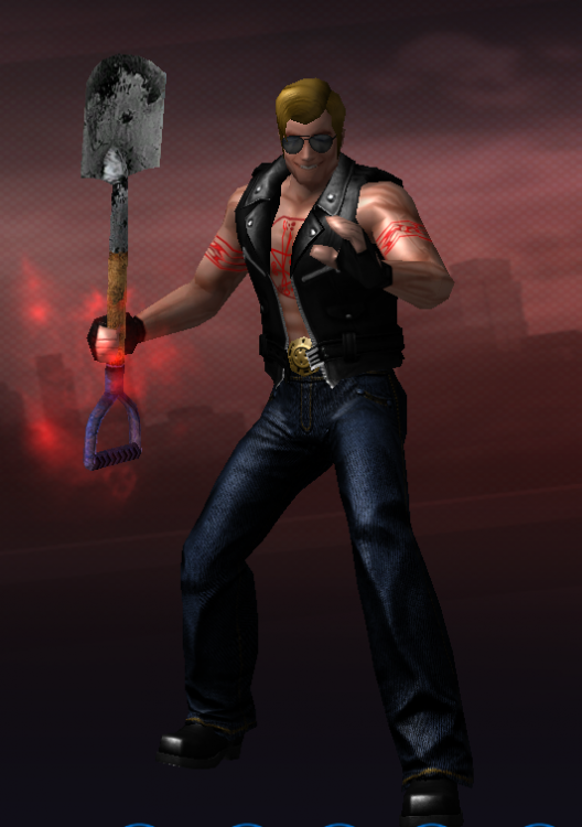 My take: I gave him a slightly more ridiculous "cool guy" haircut. The "Johnny" name makes me think of over-the-top characters like Johnny Bravo (the one from Cartoon Network, not the Brady Bunch) or Johnny Cage and I wanted to emphasize that silliness. More cool guy stuff: aviator shades, tribal armband tattoos -- but evil tribal armband tattoos -- stylish jeans, a big ol' belt buckle, and I kept the jacket style but made it a vest because c'mon bro, why cover up guns like these? As a nod to his dark secret, I added the Ghosts aura around his shovel in combat as the damned souls try in vain to escape their horrible fate. mcstyle.costume
