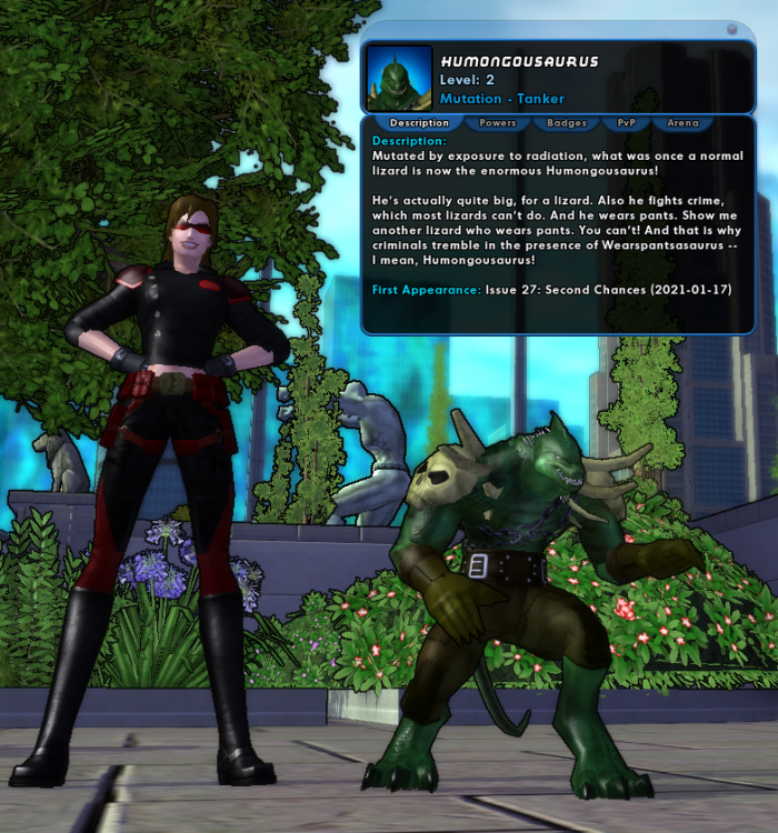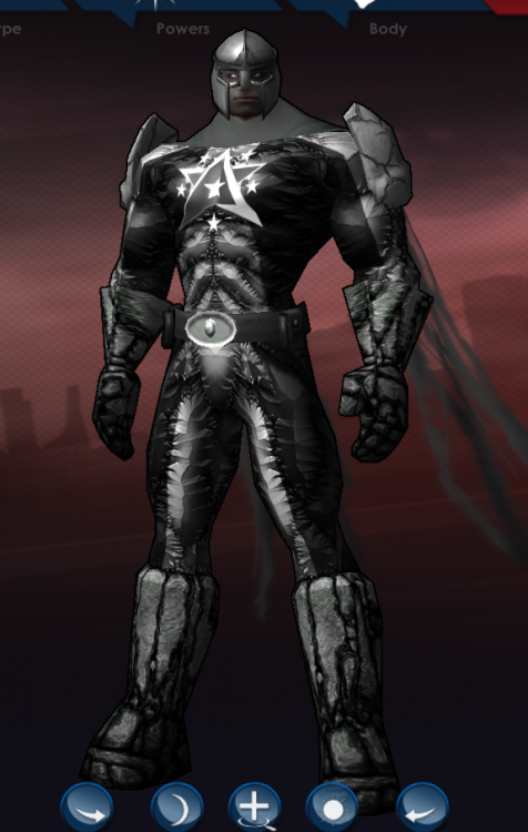 I took this idea in a very different direction based on the "living shard of Paragon" concept. What makes Paragon, Paragon? Yes, the people; yes, the heroes running around all over the place; but is there a physical feature that's unique to Paragon, that I can represent in the costume creator? (Basically I played back the "we need a symbol" scene from Ghostbusters 2 in my head.) Of course there is. Many, in fact. One of them is the first thing we see when we log in with a new character for the first time, assuming we skip the tutorial. We all gather in the shadow of one for costume contests. Positron and Valkyrie hang out at the foot of one so that new heroes know where to find them when they're in need. Improbably-huge statues of heroes who made the ultimate sacrifice for the people of their city are everywhere in Paragon. That led me here: a living statue of Paragon City's greatest and most well-known hero. I tried to keep him from looking too clean and prefect, to present something that looks like it's the city itself rising up to protect its inhabitants, Sort of a good-guy version of the Devouring Earth, rather than something created by a person intentionally -- though maybe it's a little of both, a partially-finished piece that came to life before it could be perfected. Is it the spirit of Statesman himself, knowing Paragon still needs him and refusing to cross over? Is he forever linked to the city on some existential level the same way Ghost Widow is linked to Arachnos? Is it all a big hoax, like the Reign of the Supermen? I don't know, that's for you to decide. stone-statesman.costume
