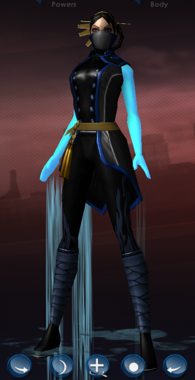 I find it's always best to opt for "inspired by" rather than "literally a recreation of." Not only is it safer from a copyright/generic-ing standpoint, it allows you to get creative and figure out what's going to look good in City of Heroes without worrying about whether any particular detail is "correct" or "accurate." Plus the whole point of a character-creation system in a game is is to use it to create your own character. Make a Claws/Regen scrapper with a shadowy past and an attitude problem, but don't try to actually make Wolverine. Make a spunky blonde teenager who's super-strong and hunts supernatural monsters, but don't worry about matching Buffy the Vampire Slayer exactly. In this case, "water-manipulating martial artist who uses her powers to replace the arms she lost" is a great starting point, but that's all it needs to be, and probably all it should be. With all that said, here's what I was able to build on that foundation. I tried to take the general concept and fit it into the game's context of "modern American city where superheroes are totally a thing." There's still a definite Chinese flavor to the design, obviously, but I think it fits into Paragon City rather than feeling like it was plucked from some other universe. Maybe she's tied to the Tsoo somehow? I used the Spectrum chest and gloves (plus the Slime aura) to try for a watery look on the arms, and I think I mostly achieved it. The main issue I ran into was that all of the robes we have sport a neckline that doesn't completely cover the upper torso, so the "water" showed through at the character's throat. I remedied that (to a point) with a mask even though Ming-Hua doesn't wear one, and added the Spiked Collar that's hidden under "shoulders" (never could figure that one out) which together almost do the job if I camouflage the collar by coloring it the same way as the robe. The way that the gap keeps disappearing and reappearing when she breathes bugs me in the character editor, but in-game is should look fine. waterbender.costume