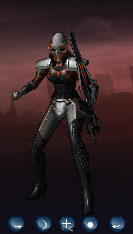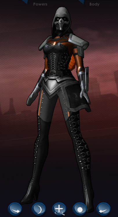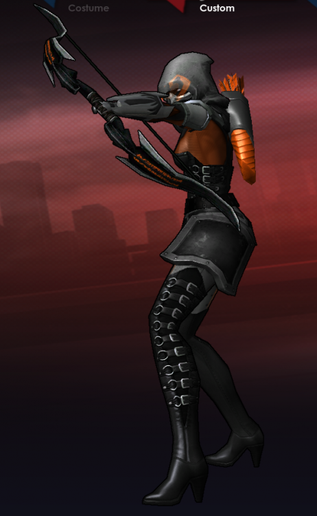 My attempt: With a name like that (plus name-dropping the Taskmaster), some kind of death/skull imagery was needed. I kept the corset but used a version with slightly more coverage; I wanted to make it look like a tactical/protective piece. Changed the chest texture underneath as a result. The asymmetry thing others are doing really works well for an archer. I armored up her left side more than her right because that's the side of her that's facing the enemy when she's firing at them (Justice gloves on both hands, one with plate, one without). Protect the side that needs it, but otherwise stay mobile for spinning kicks and the like. Shamelessly stolen from upthread: HUD + hood + eyes against a black background = badass, or at least that's what I was going for. MurDiddlyUrderer.costume