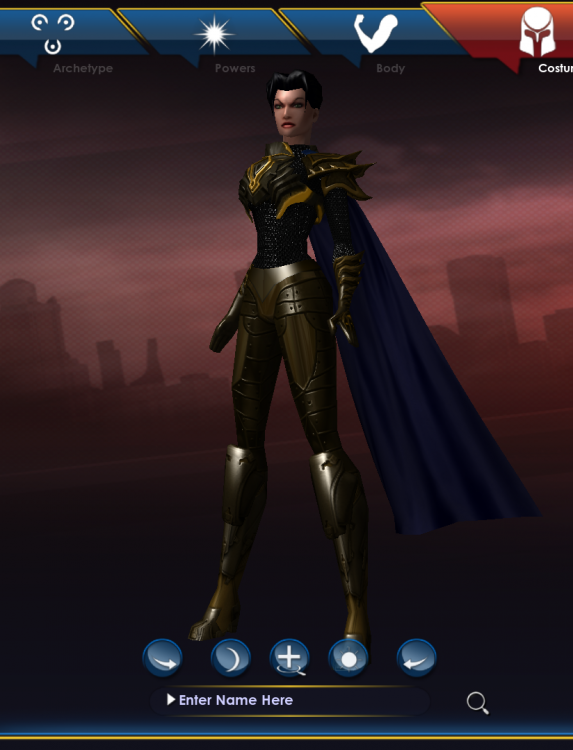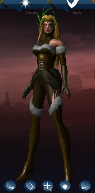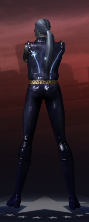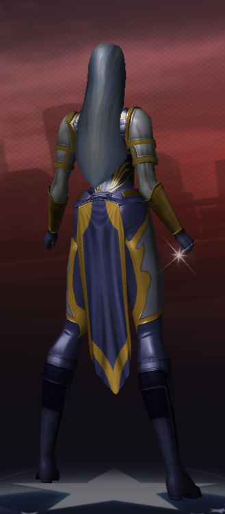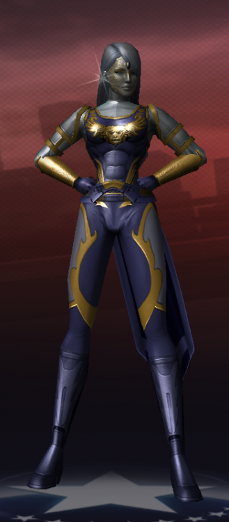 This is Adamant Eve. She's one of my favorite alts, and I have a lot of alts. The first of only two (so far) of my 50s from live that I've taken all the way to 50 again on Homecoming. As one might imagine, she's an Invulnerability/Super Strength tanker, sort of in the vein of Colossus from the X-Men powers-wise. She's magic-origin, though I've never really come up with a backstory more specific than that. I feel like "magic" in her case is a power source rather than a skill, so more Wonder Woman or Moon Knight than Doctor Strange or Zatanna. I've tweaked her look from time to time over the years, but from day one it's been basically what you see here: silver metal "skin" and blue-gray clothes over the top with gold accents. And it's... fine, I guess? But it's not exciting to me. I'm not really a fan of the whole "street clothes as a superhero costume" approach in general, but unfortunately, it's where I keep landing with her, mostly because I want to be able to show off that she's made of metal (it's kinda her whole "thing") without having her run around nude or basically so -- applying a pattern over the metal just looks like it's painted directly on her body. So I've ended up using shirts, jackets, robes and other styles that sit above the main layer so I can put the Metallic pattern underneath. Trying to show off a lot of skin without showing too much skin is kind of a paradox, who knew? But maybe someone here can improve on this, solve the problem in a way I haven't considered. I'm open to changing pretty much anything about her design except for it being obvious at a glance that she's made of steel, and I'd very much prefer to steer clear of "titillating" and toward "badass." Looking more like a magic-powered superhero instead of a regular person who happens to be extra shiny wouldn't hurt either.