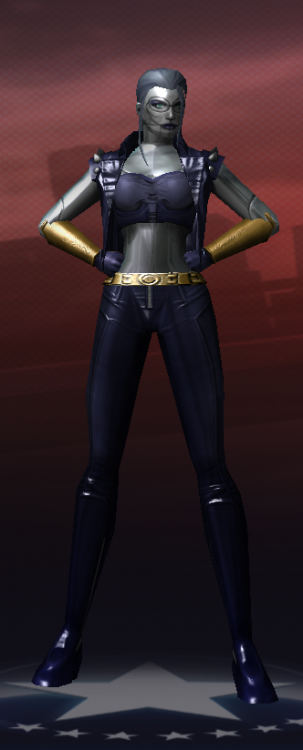 I've tried similar looks to this before, for whatever reason they didn't sing for me. Maybe it's the horizontal lines on the top? I've never been a fan of that particular piece, especially on a female torso. The other one I like better, but it has those open sides and only tends to look good over other "clothing" rather than "skin." But I kinda love the Barbarian Ring on the upper arms, there's something there I think. It subtly bulks her up a bit, implies more strength. I had her in that same shirt for a while on live! I actually really like the way the side panels on it flow with the pattern on the pants, and I'm a big fan of the way the belt's lines interact with the pants too. Even if I don't end up using that combo for Eve, I'm going to tuck it away and use it for something. Boy, those glasses look better than the eyes on the Metallic face, don't they? I've never loved that face. I wish that new "Metallic 2" texture without the robot-lines had been ported over to female characters too. Also, the shoulder pads. I like. Same as above, these make her look more powerful in the upper body. It's a shame there's such a stark separation from the shoulders themselves; the texture could simulate metal skin with the right coloring, look like it's a part of her rather than something she's wearing. Actually, now that I think about it, the Valkyrie 3(?) shoulders could do the same, with the trim/edges providing a nice accent similar to what Cutter's use of the Barbarian piece did. I'll play with that. More sunglasses! Yeah, I should definitely do something about that face, the blank version makes her look like a robot. The shades help that. They add a lot of personality. I've used that same smoke trick on another character when I needed a grizzled old soldier with an eye patch chomping on a cigar. It's subtle, but it really adds a neat effect. The use of a pattern on the "skin" under the "clothing" elements is here nice -- again, that pattern in particular with the bicep rings is a good look (I keep coming back to that same general place, there's definitely some potential in it). In fact, now that I think about it, maybe there's a way to get past that problem with the open sides on the Roman chest plate after all.... I've tried it, and every time it's something I want to like more than something I actually do like. I think the problem is that it only covers the upper torso, leaving the midriff area exposed. That isn't terrible per se, but without being able to use it with a jacket/robe/whatever to make it look less like a really elaborate bra/bikini top, it doesn't really do what I want it to. The piece looks great over tights or other costume-costumes, but over "skin" it just creates that "near naked" look I'm trying to avoid. Basically if I color it like her body she's nude, if I color it like her clothes she's fighting crime in a fancy tube top. The rivets and bands -- any adornments, really -- aren't necessarily a bad thing, though, and might even help with the "magic" aspect. I really appreciate the help, everyone! You're getting wheels turning, thank you!
