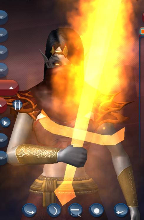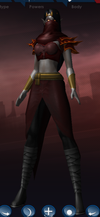 I think you're right (or... right about being wrong?). Ultimately, "insane space genie" is not a concept that demands subtlety. So here's what I came up with. I leaned a little harder into "genie" than "space." Red because it suggests fire but is also associated with danger, blood, etc. -- hopefully that helps communicate "sinister." I also tried to get that across with things like the inhuman skin color, pointed ears, and face with strange markings and glowing eyes. The Reaper mask helps make it look a little less Mortal Kombat-y while also being loose cloth, which, again, I think helps with the "genie" look. That's also the reason for the gold wristbands -- Disney put some similar bands on the Genie in Aladdin, and while we're by no means beholden to that specific depiction of genies, stuff like that (and to a lesser extent, the bare midriff) acts as a convenient shorthand, telling a viewer "genie" without actually coming right out and announcing it. It's like putting glasses on a character to indicate to the audience that they're smart. Circle of Thorns shoulders hopefully further the "fire" theme, producing a similar effect to the robe in the original design. I changed the hair to Hard Candy because it covers up the "seams" between the mask, jacket and top well. The costume file has a Bio Plasma aura on the eyes, but I turned it off for the screenshots. I think it makes her look more dangerous and powerful, and the "lines" of that aura in particular flow really well the the pointed ears. Personally I feel like this looks a little boring in the editor, but with fire a lot of the heavy lifting as far as making the design visually interesting is going to come from the powers, whichever way you decide to go. So in this case I think that's okay. It will look more exciting in action. spacegenie.costume