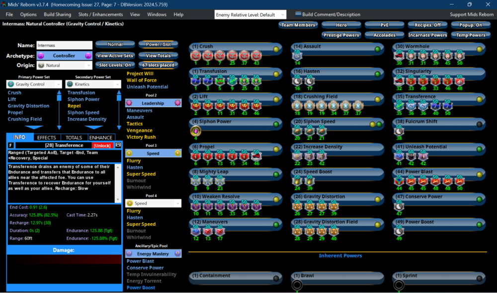 Hi all, I've been messing about with my Grav/Kin and whilst it is fun to play, it's a bit, "meh" so I've put this together in Mids. Problem is, I'm not really sure what the build focus should be, they don't tend to get stuck in to mobs so melee defence isn't that important IMO, damage stats aren't amazing so slotting for +Dam seems to be a waste, it all seems a bit general. What do you think of this build? What would you change? Or not change? I appreciate your time looking at this. |MBD;23392;1450;1936;BASE64;| |G19bAKyKx/lXLKSkJLigx4yXS5GuPXvdXuXROCbM/QodWdL0QarMkqWrr3VYQLo6Y6b| |y6K6XAPmUnpK1mVZFOfdljtL7Y8S4y9NoMbQAz/5+3953NhbhsDhkJK3uHtRzOvveLC| |W1OUqVrc6vlNJlbb6pOA7OB+0yS9s76hehYkGi4h1EuKgMXabi/RSEgluot3vEIkcq+| |nLywVoEPx31YxO3SKcg86cJjndevwvgIQ0RBCWLBH4Zu50zxbl/vVOHgYXU5LZ9DpC4| |e8jxVo7hHQxJ4e8U0QuZZZgCA23tCW9/t0MGhey3FroH2d1fQ71xXm9425FM3vEXXeT| |PD+9d62Z/zJ93DnXFkXgdx3aro3Uv6j6HwzbqlcuyjqvlL2AELD9PKVt5z3hvlu7bSD| |3F+L56im0xbX2lA+8rFXsDoUNA9sSaFi2fSeEuMUS7b8qrJsX7zvmolv6TSzQzsrdxZ| |OxnU/ZtQ3tLc/Bnknh0n0h4/7Xo+l8Yi+vVdZNzKLgaF5xL0Nfrrlb6RtbAskdtxM+r| |gwDdl2OwJaz3FVMbHAKynksXB4WDQo/73+h7EPro7EOQB5wCo458/cpPaKZrYfju1F7| |/J3ltCsWwOSjClWQ5FCJJDQqQpBV3w+pmebVYYXXbvHGku46rDAmtBpuhlKN5BaeZWc| |nVg0wWEUhslAbDtfWZOLpAJsOtxW9jIgxfmuramCRO66BoYL6asMVlh3D0WemyClNlp| |VfGXEsMNsElTjMj+B8XK3ax11VY5Pc7q2z7pgxjwv8jqHN4fKACcQVXLtOhEnERFoUq| |xCUkZ6EakRn2WotUtXcoXTO8VsJWVmw9DfmQS04d4dxesJnbyvE4zsx2H/NzAZm1gGe| |MjAWb4TYM9xTOaTJUOrL4Kw+Yev31zI/UKMCVTzkYwn6hBMnLAMaRKUWeV9cYcG6hLO| |3pTqFe4M1bW+lpr3zU0nC4C8Pre4e5BuZy+oqewZNXzvJKUit8pNqdF+QJzi/EwnsyA| |oc7zeFWfuSHoTdwsMaDo6pYJqEtp6Dlma5OzPpKSx2MYNswhu1GjGpj3/ktkWK4QgMm| |DNNZm3GK+n/oP8GnnDdD7gzrld9aJzoVREVR7Yw9HfnESi/QNiuwYdjb4uPK4WTeKpF| |EJZB+KcD3XVKNgaXA7U5zu54J3pWYHK/RiEoP+REg/MykfuemR48kAbw4zUtOcKaqUu| |qaC9LwSAzcFVQeRHGS6wugEBUhA0aIYqCvEZqBGcSz9F31MtxlZzAZNu7q94rw9OfKl| |jOpBKbg6gpaOF17C5Wt/Fq1PG1L5pCU3Y0j3LUSs2GNohoyDqnmVgzzHhNRCabgy0xJ| |XaqZ72NGFA0K2O40201AgiG1X2saZ+qE1QfPVfx5o7RWR7aGJw3ghuF2FoVdSxpBGu5| |MjbAqCpo5s1Gno3d5ew8AEw0MYZazdSp6jCLUF47uHSvynGHIYtWrQC1UcE2OJPfWW9| |3fxjjl7XrBFRvGsH8oQfIuFCD5Cn2o8ba1sMEN7PkMmNCWMKwpsLwsDIU3T6gfkbviq| |xCH7BojzmGCSBow6gxv44oHEnp3xy8NTetkt81VfsAFPasp6mkXB3py9dVlFYprxv4k| |Mg60c2ibfo8BucMxXJJOrMxmXGMsvuRz6Sv7CbrslyNP4j7sdYPU5Fc4Y4vqdaIKnNR| |H2QOeJtmmwgYvMZO3Z8IUVivzZNGqUlGs6afm7ar3ME2GkQEbpt0o3hlL91uYEsToKp| |d7EOxgPKT6WZ8Fy5MXBrC4ShLBqvPk7/SQEsv5QjePj8bkwLMTQPKVUUisGAF8UPMi2| |Mvavp14JKY8m30x8iYQKwrcEQw2vYE/d0PRgS9V4uZ6s4PfTo/SuRM0KcGhjpWg/4z0| |77Ce9Wgrf0d+mb2Bv2+n0R/TlcOAvyvVcqqLY8FT6leGXNNxGqWQKGtXAw==|