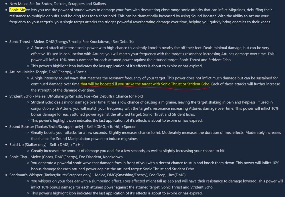 Good job compiling that Wravis. I think it's fine to actually just call this out right now: specific ideas become set in stone very early in Homecoming testing/feedback cycles and then all feedback requesting changes to those ideas functionally gets ignored. They don't want us to bring up previous powersets or patches but this is a pattern of behavior. This has happened before, multiple times, and we are justified in bringing it up. Don't let Sonic Melee end up like Cone Devour Psyche on Psy Armor Scrappers. Psy Armor players universally hate dealing with it as a cone AND it has mechanical anti-synergy with the rest of the armorset: you need to hit the enemies in melee range first to utilize the bonus effect of Mask Presence, then jump back out of melee range to try and line up the cone Devour Psyche... that's genuinely bad design and it's because 2 ideas are clashing with each other. It's okay to admit you were wrong. -