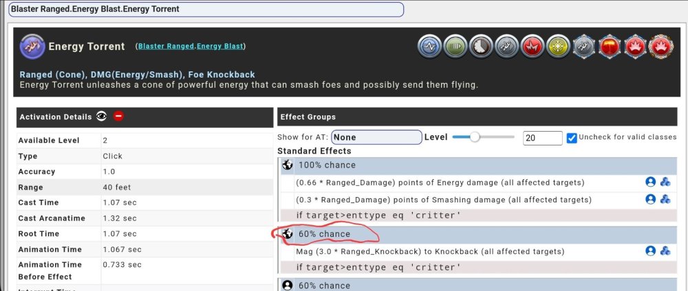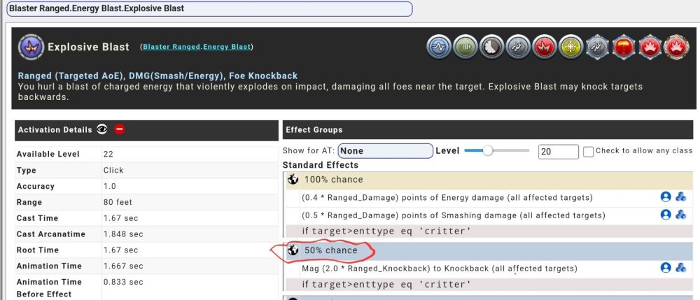 The existence of powers that have guaranteed KB or KD (Upthrust and Enhanced Water Burst are both 16 target AoEs with guaranteed/100% chance of KD) has been what really invalidated Energy Blast as a set for quite a while now. Even if you specifically wanted to push enemies around and have it be consistent, Gale is far and away a better power than all of Energy Blast as a set. Until the devs change something about Energy Blast: you need KB-to-KD slotted in all of the AoEs just to not be actively detrimental to your team. -