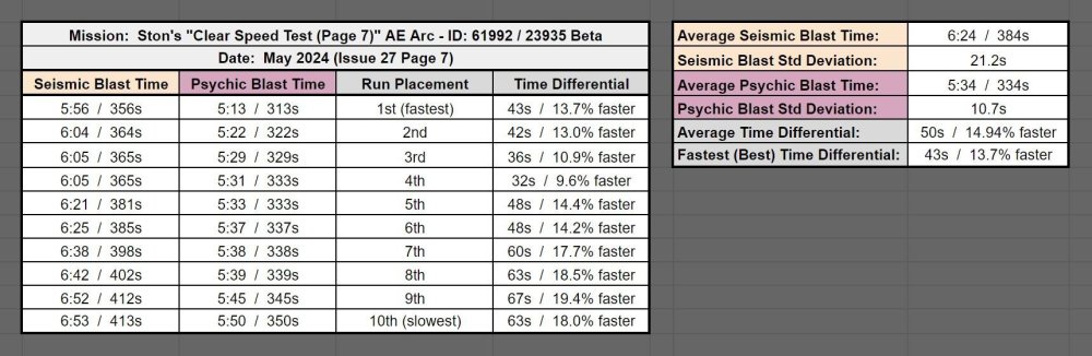 @Player-1 Here is my data. I have my own conclusions, but the only thing that truly surprised is how volatile a gimmick set like Seismic Blast is compared to a gimmick-less set like Psychic Blast. Seismic Blast can't execute a planned attack chain or flowchart in the way that some other gimmick sets can (Energy Melee, Water Blast, Street Justice), because the chance to get Seismic Shockwaves is not consistent and because you don't have a tool to instantly grant it... such as Tidal Force or Build Momentum. This appears in the data as Seismic Blast having over 2x the standard deviation of Psychic Blast: despite me building 2 near identical characters (as previously discussed). I have to adapt more to "whatever happens" while playing Seismic, which does cost time both in terms of bad luck but also the player needing to mentally be reactive instead of predictive. I think this also validates 2 of my suggested changes in my original post: which are both based around more uptime of Seismic Shockwaves (more consistency). The times from my previous videos are not in this table because I practiced the map more and play it better. In my recorded runs I was fighting one spawn at a time, but in this data I began to pull stragglers forward with me and immediately use my powerful abilities (such as my Nukes), the second they were off cooldown: fighting 2 spawns at the same time. This resulted in much faster times for both builds, practice makes perfect.