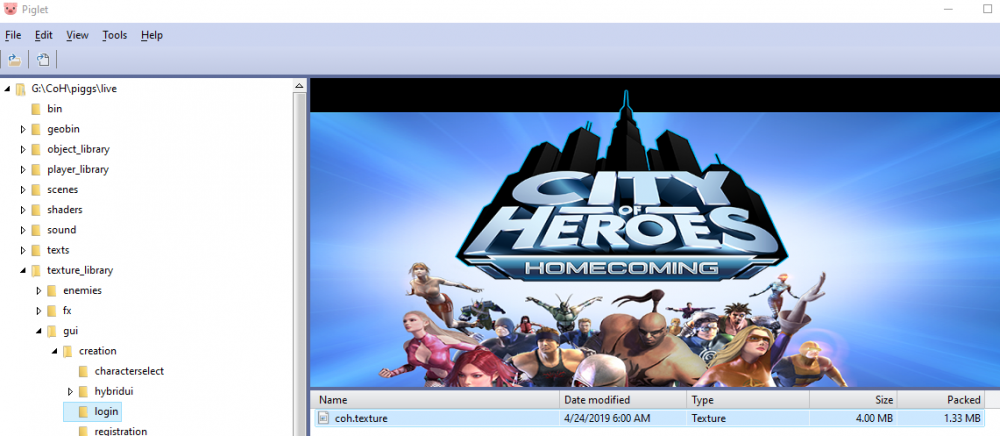 I am not super familiar with login screen mods, but just to be clear, are you talking about the screen at startup where you enter your username and password? If so, it looks like that texture is named 'coh.texture' and it goes in: <CoH Install Folder>\data\texture_library\GUI\CREATION\login Here's a screenshot of Homecoming's custom login screen, viewed from within piglet (the image doesn't display completely, but you can see enough to recognize it as the login screen). The capitalization on the folders doesn't match (and I am 99.9% sure it doesn't matter) but you can see the folder path if you follow the folder levels on the left and you can see the filename below the image. If that one is the one you want to mod, I can assist with that, but it'll take a little more work than just changing the filename. There is a header in the texture that needs to contain the correct filename as well.