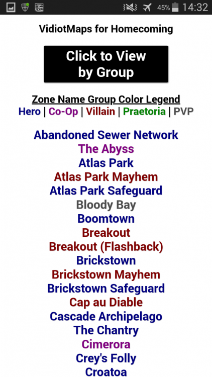 I created a basic offline HTML map viewer a while back for personal use, but I thought it might be useful to the community at large. There are three viewers available: One that includes the VidiotMap image files available from the Homecoming Wiki, as well as any maps that were updated and/or new zones that are included in Blondeshell's MoreMaps4U update pack and my vidiotmaps updates. One that includes the optimal collection paths for badges and plaques, computed as solutions to travelling salesperson problems (TSP) and based on the most recent vidiotmaps. One that includes the Halloween event giant monster spawn maps and the winter event gift maps that I created. The zip files are available at the links below: CoH Zone Maps CoH TSP Maps CoH Event Maps The folder inside each zip file contains all the needed files. Simply save that folder to your location of choice. To use the zone maps, simply open either map_alpha.html or map_grouped.html in your browser of choice. To use the TSP (optimal badge/plaque collection path) maps, simply open either tsp_alpha.html or tsp_grouped.html in your browser of choice. To use the event maps, simple open either halloween_alpha.html or winter_alpha.html in your browser of choice. Each viewer has a large black button at the top (see the screenshot below). The button in the zone map viewer allows you to switch between alphabetized maps and maps grouped by zone type. The button in the TSP map viewer allows you to switch between alphabetized maps and maps grouped by zone type. The button in the event map viewer allows you to switch between the Halloween and Winter event maps (with zone names displayed alphabetically). For the zone map viewer, zones whose maps have been updated for Homecoming servers (i.e. the maps available in the vidiotmaps for Homecoming updates) will show the updated map above the older ParagonWiki version of the map. Keep in mind that the older maps from ParagonWiki may not be 100% accurate (especially in terms of badge/plaque locations) and are included for historical reference. Other zones that have remained relatively unchanged on Homecoming will only display the ParagonWiki map. The badge/plaque locations on these maps should be reliable but do keep in mind that these maps may not be 100% accurate either. The TSP map view uses the most recent available vidiotmaps map. The winter event and Halloween event maps utilize the stock in-game maps. I am not a web designer so don't expect too much in terms of the HTML interface. I learned enough HTML and CSS code to make it functional and relatively nice looking, and it's worked well enough for my purposes. If anyone would like to expand upon it, feel free. Credit goes to Blondeshell and anyone/everyone that worked on VidiotMaps in general. Here's a preview of what the zone map viewer looks like on my phone: