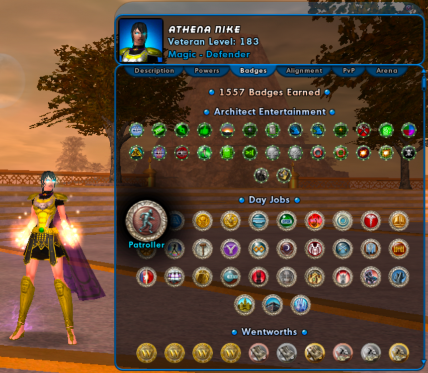 7. My supposedly-all-knowing goddess is getting there. Still got 24 or so to go. My "closest to completion" says I'm missing Triple Threat and Master of Magi... lycans, 50 Weekly TF assists, incarnate Cims, RHW and refusing 1000 recipes. Other than that... I'd better try this badge tracker thing, because that doesn't add up to 24.