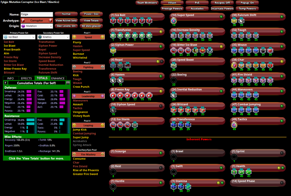 Heh, I just happened to throw together a Build recently. Maybe you or anyone else could use some inspiration from it. Seithkona - Villain Corruptor Build plan made with Mids' Reborn v3.6.6 rev. 3 ────────────────────────────── Primary powerset: Dark BlastSecondary powerset: Cold DominationPool powerset (#1): FightingPool powerset (#2): SpeedPool powerset (#3): LeadershipPool powerset (#4): FlightAncillary powerset: Psychic Mastery ────────────────────────────── Powers taken: Level 1: Gloom A: Apocalypse: Damage3: Apocalypse: Damage/Recharge3: Apocalypse: Damage/Recharge/Accuracy5: Apocalypse: Damage/Endurance5: Apocalypse: Chance of Damage(Negative)7: Gladiator's Javelin: Chance of Damage(Toxic) Level 1: Infrigidate A: Invention: Accuracy7: Impeded Swiftness: Chance of Damage(Smashing)9: Ice Mistral's Torment: Chance for Cold Damage9: Shield Breaker: Chance for Lethal Damage11: Achilles' Heel: Chance for Res Debuff11: Touch of Lady Grey: Chance for Negative Damage Level 2: Moonbeam A: Superior Scourging Blast: Accuracy/Damage13: Superior Scourging Blast: Accuracy/Damage/Endurance/RechargeTime13: Superior Scourging Blast: Accuracy/Damage/RechargeTime15: Sting of the Manticore: Chance of Damage(Toxic)15: Cloud Senses: Chance for Negative Energy Damage17: Gladiator's Javelin: Chance of Damage(Toxic) Level 4: Ice Shield A: Luck of the Gambler: Defense/Increased Global Recharge Speed Level 6: Boxing (Empty) Level 8: Tenebrous Tentacles A: Cloud Senses: ToHit Debuff17: Cloud Senses: Chance for Negative Energy Damage19: Centriole Exposure19: Peroxisome Exposure21: Positron's Blast: Chance of Damage(Energy)21: Bombardment: Chance for Fire Damage Level 10: Glacial Shield A: Luck of the Gambler: Defense/Increased Global Recharge Speed Level 12: Night Fall A: Superior Malice of the Corruptor: Accuracy/Damage23: Superior Malice of the Corruptor: Damage/Recharge23: Superior Malice of the Corruptor: Accuracy/Damage/Recharge25: Superior Malice of the Corruptor: Accuracy/Damage/Endurance/Recharge25: Superior Malice of the Corruptor: Recharge/Chance for Negative Energy Damage27: Superior Malice of the Corruptor: Damage/Endurance/Recharge Level 14: Tough A: Unbreakable Guard: Resistance34: Unbreakable Guard: Resistance/Endurance36: Unbreakable Guard: Resistance/Endurance/RechargeTime36: Unbreakable Guard: +Max HP36: Steadfast Protection: Resistance/+Def 3%37: Gladiator's Armor: TP Protection +3% Def (All) Level 16: Weave A: Luck of the Gambler: Defense/Increased Global Recharge Speed33: Shield Wall: +Res (Teleportation), +5% Res (All)33: Shield Wall: Defense/Endurance33: Shield Wall: Defense34: Shield Wall: Defense/Recharge34: Kismet: Accuracy +6% Level 18: Hasten A: Invention: Recharge Reduction31: Invention: Recharge Reduction Level 20: Arctic Fog A: Luck of the Gambler: Defense/Increased Global Recharge Speed46: Luck of the Gambler: Defense/Endurance48: Luck of the Gambler: Defense50: Luck of the Gambler: Defense/Endurance/Recharge50: Luck of the Gambler: Endurance/Recharge50: Reactive Defenses: Scaling Resist Damage Level 22: Super Speed A: Blessing of the Zephyr: Knockback Reduction (4 points)46: Blessing of the Zephyr: Run Speed, Jump, Flight Speed, Range/Endurance Level 24: Benumb A: Invention: Accuracy Level 26: Blackstar A: Superior Avalanche: Accuracy/Damage27: Superior Avalanche: Damage/Endurance29: Superior Avalanche: Accuracy/Damage/Endurance/Recharge29: Superior Avalanche: Accuracy/Damage/Recharge31: Superior Avalanche: Recharge/Chance for Knockdown31: Armageddon: Chance for Fire Damage Level 28: Sleet A: Superior Scourging Blast: Damage/RechargeTime45: Superior Scourging Blast: RechargeTime/PBAoE +End45: Superior Scourging Blast: Damage/Endurance/RechargeTime46: Invention: Slow Level 30: Heat Loss A: Preemptive Optimization: EndMod/Recharge43: Preemptive Optimization: Accuracy/Recharge43: Preemptive Optimization: EndMod/Accuracy/Recharge Level 32: Maneuvers A: Luck of the Gambler: Defense/Increased Global Recharge Speed37: Luck of the Gambler: Defense/Endurance48: Luck of the Gambler: Defense/Recharge48: Luck of the Gambler: Endurance/Recharge Level 35: Dominate A: Nucleolus Exposure37: Gladiator's Javelin: Chance of Damage(Toxic)39: Ghost Widow's Embrace: Chance of Damage(Psionic)39: Gladiator's Net: Chance of Damage(Lethal)39: Unbreakable Constraint: Chance for Smashing Damage40: Neuronic Shutdown: Chance of Damage(Psionic) Level 38: Tactics A: Invention: Endurance Reduction Level 41: Mind Over Body A: Unbreakable Guard: Resistance42: Unbreakable Guard: Resistance/Endurance42: Unbreakable Guard: RechargeTime/Resistance42: Unbreakable Guard: Resistance/Endurance/RechargeTime Level 44: Assault A: Invention: Endurance Reduction Level 47: Burnout A: Invention: Recharge Reduction Level 49: Frostwork A: Preventive Medicine: Chance for +Absorb ────────────────────────────── Inherents: Level 1: Brawl (Empty) Level 1: Scourge Level 1: Sprint (Empty) Level 2: Rest (Empty) Level 1: Swift (Empty) Level 1: Health A: Panacea: +Hit Points/Endurance40: Miracle: +Recovery45: Numina's Convalesence: +Regeneration/+Recovery Level 1: Hurdle (Empty) Level 1: Stamina A: Power Transfer: Chance to Heal Self40: Performance Shifter: Chance for +End43: Performance Shifter: EndMod Level 49: Quick Form Level 22: Speed Phase GxpiERWcCAAtjzeGRj3xIBUVYYtdGbp3mZg+Io4P5YrwUo1axYjnbUf+eLCqGXUR/a05lZ/qXToimTxx80NjOFm6+lqHBaSrDqfKzsznNYCpWla1hpq93OPtXd779wItjddEKNIQqeQPkJ/2q8W70AmNkqg6v+2FiklIzMx/g+jfxe2TVN6wN4hJ+/FzCdeQaIXNiMVyb7D/EE3SNsG1vba9YmM0WUR5BhjIfpEPxSL5pULcWeBxJBJXP20CyPEpbp4rsV10PsMz9JDGJKBoT8C3ocdJS5x9bzXfasy3EDE/uzMidyE5f+0srPdxhPUUa0pjEzplY1PUz+Zv0EhoGPZn16nkdx8YHPu1KaVwkfkSs1E0We0fwpPnNQZkraqozhpbUSbP3j51j5jGts2qaFGWyFTcLKSecoLJrH8F1ynVLFgiPSzzEOXR90xRB5e5+n3ZuWQDTPF9Ospeyq3Tk71zdmhErM9qYK7UYOsNY/HZiFlLvrzwGnFQmLTKJyb1ZtRu5epwYN1AyU3