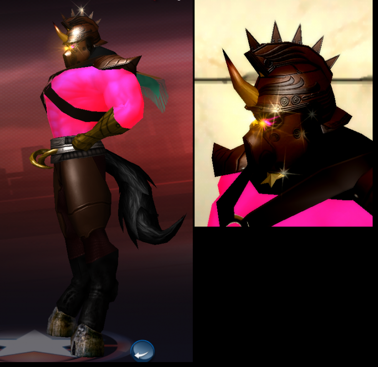 Rhino Horn and get creative with finding a way to conceal the second horn. Meet Shadowgnash: Here I am using a golden Rhino horn with one of the Roman helmets using tinted brown elements to make all this headgear look like leather racing horse attire. Check out my slick blinders! I have also seen others use the the Wild, Cybertech, or Mohawk hairstyles mixed with Rhino Horn or Thunder Horns with some success. If neither of those seem to work, consider trying out a mecha-unicorn concept. For some reason, I find making non-humanoid creatures easier as a mecha with the costume builder CoH has.