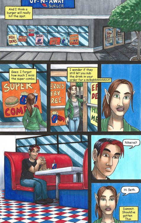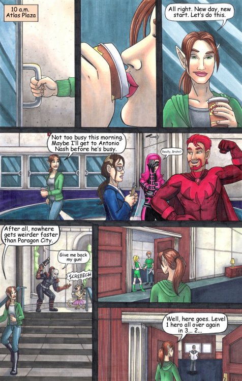 Glad you like it, folks! This was a fun page to do. I enjoy putting in cameos, partly because it delights people, and partly because it means I don't have to make up convincing background characters. It's the same reason my backgrounds are so detailed, actually: I'm working from actual screenshots most of the time. A few things: The full name of the coffee Nyx is drinking is 'Power-Up Coffee', which, much like Flying Pie, is a fictional brand I'm going to be putting in the comic. You'll see the full logo later if/when she spends any time at a coffee shop. I spent an unreasonable amount of page space in my sketchbook trying to come up with a logo, which in retrospect seems a little silly given how little of it you can see under Nyx's hand. (In my personal head canon, they offer discounts for heroes, which scale with their clearance level, like 10% for a 10th level hero, 25% for a 25th level hero, etc.) I have other businesses I may include someday, including a dry cleaner who has Seen. EVERYTHING. and just cannot be surprised or horrified anymore. A lot of people comment on the way I do marble. Well, here's my method: First I do a flat layer of color. Then I take a shade that's 1-2 steps darker, dab it on a wadded-up scrap of tissue, and dab that stained tissue on the page where I want marble texture. This is.... dangerously imprecise, so I have to mask off/cover up any places I don't want marble texture, so that, for example, Brahn doesn't end up with marble texture on his face. Regarding 'half' emotions-- I like drawing them because I think they're almost more natural, especially for loner/introvert types like Nyx (and myself...), who can be notoriously hard to read, and rarely have just one thought or emotion going at one time. In panel three, what you're seeing on Nyx's face there isn't quite resignation, but isn't quite enthusiasm either, and it works for her mixed feelings about taking up the mantle of hero again (yay!) but having to start over from the bottom (boo hiss). Also it's fairly chill/low-energy because Nyx is not a morning person. I'd comment that I live in Portland, Oregon... but that's not 'gets weirder faster' so much as 'is just goddamn strange all the time'.