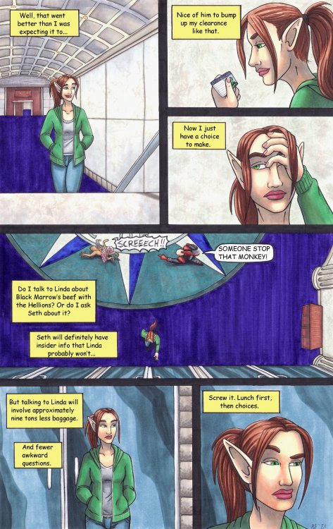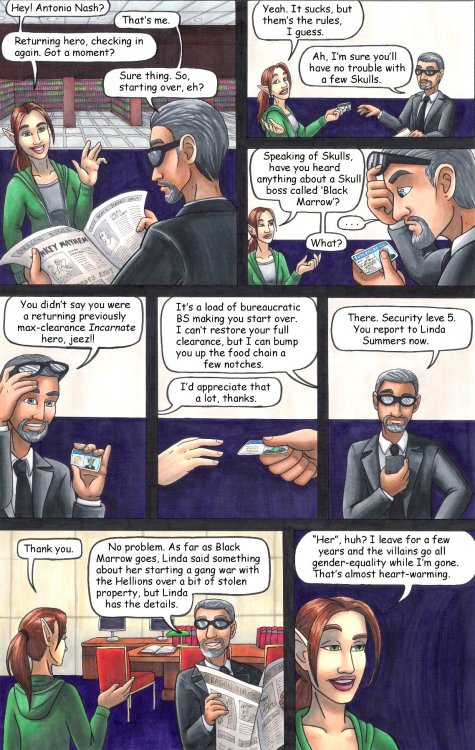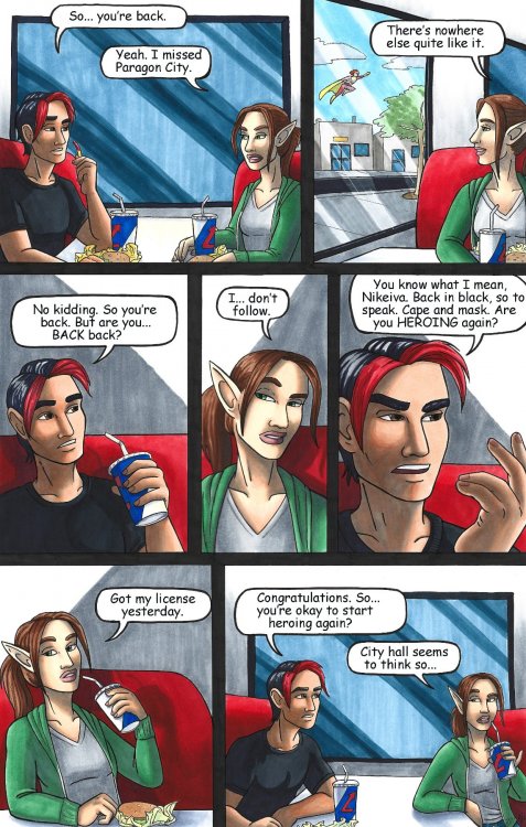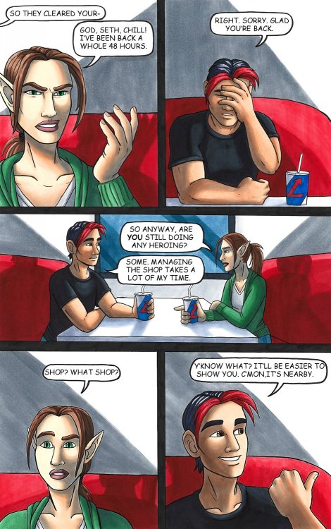 Yeah, Nyx and Seth have history. Not romantic history-- neither of them thinks of the other that way-- but origin-story-related trauma history. They know each other's dirty secrets, basically. The conversation will go there starting next page. Meanwhile, I'm going to try making a 'cover' for this issue. My thoughts were to have a picture of Nyx, either in costume or civilian wear, having a cup of coffee on the roof of city hall (or on top of Atlas), with the view of the cityscape in the background, but I'm open to other ideas, too.