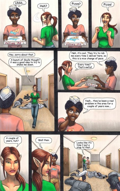 There are so many things I could say about this page, from 'I love how the colors came out' to 'I adore these doofy Skulls', to 'sharp-eyed readers who are very familiar with Nyx will not only know why she laughed at the phrase 'two minds', but also notice she's missing part of her gear at the moment'. But mostly I'm just really happy with how it turned out! 😄