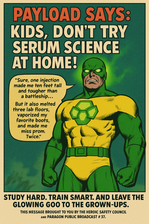 I just told Chat-GPT to give me a Silver Age style PSA warning kids not to try "serum science" at home and it added a word balloon that actually made me laugh. EDIT: Oh, I did share a screenshot and bio of Payload as well.