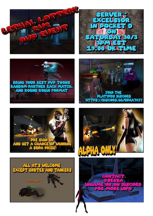 There will be a 2v2 Tourney on Excelsior Server on Saturday. We will gather in Pocket D at the monkey fight club and arena terminals. Anyone is welcome to join ,even if you never tried PvP before , the matches will be at lvl 50 with alpha incarnate slot enabled. In this event you will be able to bring your toon(s) and teamup with a random partner in a 2v2 arena match. The exact rules will be posted on the forums a bit later this week. If you pre sign up by dming me on discord or posting on forums or sending me an ingame message to global handle @Sessa and then show up at event, you will have a chance at winning a fun prize.
