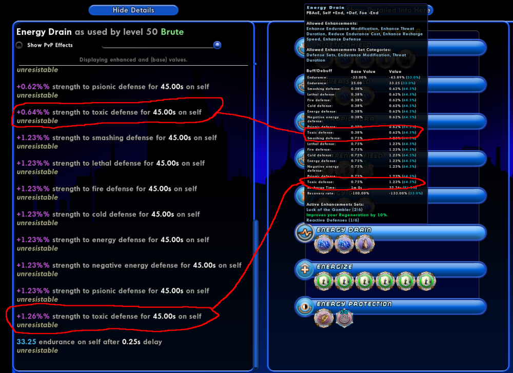 The Toxic Defense numbers for Brute>Energy Aura>Energy Drain do not match between the enhancement effects popup and Power Details. The Power Details numbers are the ones that match the gained values in the combat attributes tracker. Below is a screenshot highlighting the discrepancy.