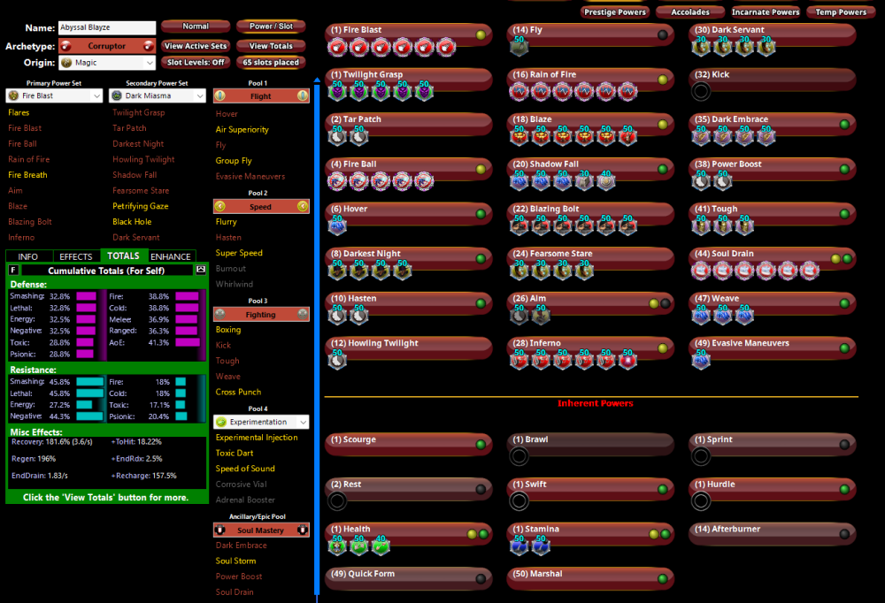 Good evening all! I had an interesting idea for a FIre/Dark/Soul Corr and played around in mids. This build is supposed to be for soloing and teaming but mostly teaming. I looked at different Dark Miasma builds since I have no idea how to build one (shout out Snarky and I think Uun) and I kind of just threw in what I did for my blaster for fire blast. I think I am more stuck on if I want tough/weave and if I want 6 slots in soul drain. I am not sure what I really need for Dark Miasma to be optimal as compared to other secondaries (as in whether getting to soft cap defense is necessary). Any feedback would be great! (P.S. - this is all before adding in Incarnates) Abyssal Blayze - Corruptor (Fire Blast - Dark Miasma - Soul Mastery).mbd