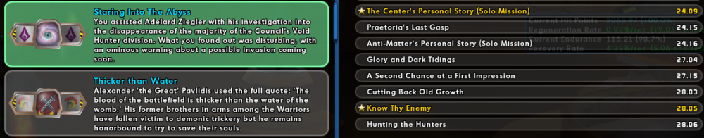 This one had some problems. Mission 2 had a bunch of collectibles and I would collect one and then the counter would either not go down, or it would deplete to zero and not complete the mission until I found the correct glowy. You ought to just make it like the first mission computers where there's a lot of duds until you collect the right ones. Mission 3 had a weird issue where when I clicked the glowies Aside from that, Mission 3 wants you to escape from the mission, but it could stand to have a waypoint directing you back to the entrance since you keep being ambushed and it's unclear if you need to defeat them all or not. Plus waypoints are nice, even if it's a little map. Mission 4 or 5 wants you to defeat Raid Leaders. Given the context of the mission, would it not make more sense they'd be Base Leaders, since they aren't actually raiding anything? They're just chilling in their own base, unless I missed something. Overall, this seems to be a second of the two hero arcs made where they build up to something and just kind of abruptly ends it. I'm sure this gets continued in another arc, but having a rather ominous conversation to conclude on doesn't really feel satisfying. I'm frankly still not sure what the major thing we did was aside from stop a bunch of Council bases, and that doesn't seem significant enough for an arc like this. I would've liked something a little bit bigger to end on. There's also a Sky Raider mission that seems kind of interesting but sort of goes nowhere too. Again, I'm sure it continues somewhere down the line, but it honestly feels a bit dissatisfying and out of place. I'm not trying to dump on this arc because there's parts I really enjoy about it, but it doesn't have nearly the same kick to them that other Homecoming arcs do where it completes stories and leaves you with a big climactic finish where you feel like you really saved the day. Oh, and after I completed this arc, it doesn't show as completed in the Ouroboros list. The other hero arc did show as completed though. Here's a screenshot of the completion badge and the Ouro list.