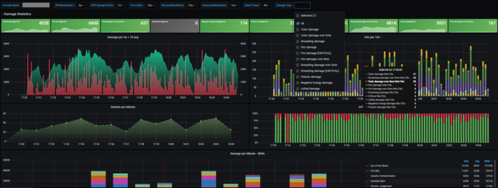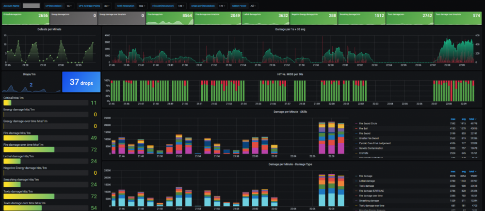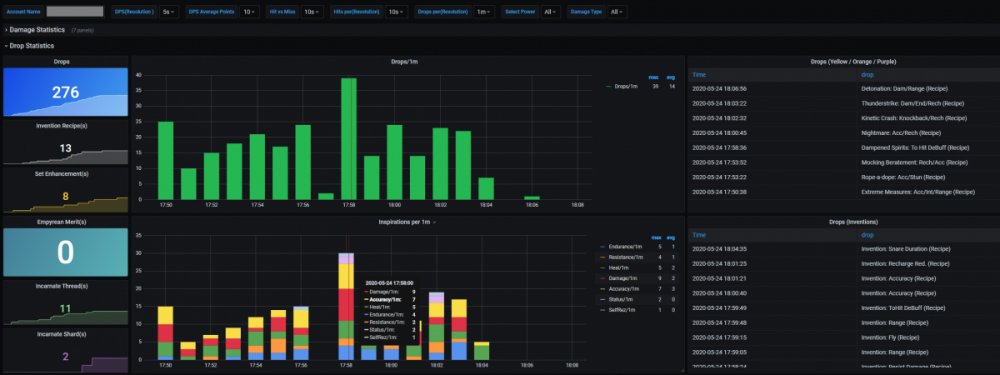 Hi everyone, i got bored one day, so i thought i should look into CoX logging, since there where some changes somewhere in the last patches. It went realy well and i got most of the interesting parts parsed from the logs, but i also ran into multiple problems. 1) Duplicates: It will happen when you use AOE-Powers and Hit alot of enemies. - You hit targets at the "same time" with the "same name" and the "same amount of damage" 2) Confusing: Some power log entries are just wrong in spelling and i dont know yet, if thats end-drain or some sort of damage? - 2020-05-22 10:49:01 You hit D.U.S.T. Leader with your ESD Arrow for 253.82 points of their endurance. 3) ToHit: It seems to me that not every time you activate a skill there will be a roll for ToHit? Is that a bug or intented? And sadly there is no possible solution to track how many enemies you hit with a specific skill other that guessing and using some black magic. Anyway i wanted to share what i got so far, maybe someone is interested in this and wants to help rounding it up 🙂 (English is not my native language, so please be kind) SETUP: Note: I already had a TIG-Stack running in my home network, so it was just connecting the wires for me. Note2: I wont give you any support on installing/configure the needed tools, there is enough documentation for that already. - Requirements ! All tools are available for Linux + Windows ! InfluxDB 1.8 (dont use 2.x) - https://portal.influxdata.com/downloads/ Telegraf 1.14.x - https://github.com/influxdata/telegraf/releases Grafana 7.x - https://grafana.com/grafana/download City of Heroes with Chatlog enabled (dont forget to add Pet Damage stuff for Blizzard/Rain of Fire etc) - Instructions First you should install InfluxDB, in most cases you dont need to configure anything, just install and start it. After starting it, InfluxDB should listen on 127.0.0.1:8086 for connections. Install Telegraf on your Machine and register it as a service and dont start it yet. -> https://github.com/influxdata/telegraf/blob/master/docs/WINDOWS_SERVICE.md With default settings Telegraf will sent metrics to 127.0.0.1:8086 Optional: If you also want to get your NVIDIA Stats while Gaming you can activate this too -> https://github.com/influxdata/telegraf/tree/master/plugins/inputs/nvidia_smi Now we setup log parsing for City of Heroes, for that you have to open the telegraf.conf file wich you should find in "C:\Programm Files\Telegraf\" - open it with "Notepad++" or an editor that you like. Go to the end of the file and add the following code snipped, but edit paths and account to fit your needs. [[inputs.tail]] files = ["D:\\coh\\ACCOUNT-NAME\\logs\\chatlog*.txt"] from_beginning = false watch_method = "poll" name_override = "city_of_heroes" data_format = "grok" grok_patterns = ['%{TIMESTAMP_ISO8601:timestamp:ts-"2006-01-02 15:04:05"} You hit %{GREEDYDATA} with your %{GREEDYDATA:power_name:tag} for %{NUMBER:damage:float} points of %{GREEDYDATA:damage_type:tag}.', '%{TIMESTAMP_ISO8601:timestamp:ts-"2006-01-02 15:04:05"} %{GREEDYDATA}: You hit %{GREEDYDATA} with your %{GREEDYDATA:power_name:tag} for %{NUMBER:damage:float} points of %{GREEDYDATA:damage_type:tag}.', '%{TIMESTAMP_ISO8601:timestamp:ts-"2006-01-02 15:04:05"} You have defeated %{GREEDYDATA:defeated}', '%{TIMESTAMP_ISO8601:timestamp:ts-"2006-01-02 15:04:05"} %{WORD:tohit_result:tag} %{GREEDYDATA:tohit_target} Your %{GREEDYDATA:power_name:tag} power had a %{NUMBER:tohit_chance:float}% chance to hit, you rolled a %{GREEDYDATA:tohit_rolled:float}.', '%{TIMESTAMP_ISO8601:timestamp:ts-"2006-01-02 15:04:05"} You activated the %{GREEDYDATA:power_activation} power.', '%{TIMESTAMP_ISO8601:timestamp:ts-"2006-01-02 15:04:05"} You received %{GREEDYDATA:drop}.'] grok_timezone = "Local" [inputs.tail.tags] account_name = "ACCOUNT-NAME" After you have saved the file, you should clean up your City of Heroes logfiles before you start Telegraf, because in this setup Telegraf will open file listeners on all logfiles he will find in that directory, so a little housekeeping is good 🙂 Now install Grafana, the tool we use to visualize the data we gathered. After installing/starting Grafana it will listen on http://127.0.0.1:3000 and serve the webui. Login to Grafana with default creds (admin/admin) and setup the Datasource (InfluxDB) and point to 127.0.0.1:8086 When everything is working you can now import my attached Dashboard into your Grafana. Start Playing 🙂 (Yes i know this is far from perfect or good, but it works. I'm happy for any input/suggestions to make this better) Note: If you want to parse old logs, check the option "from_beginning" in Telegraf inputs.tail - true will parse logs from the beginning. Pictures: NVIDIA: City of Heroes-1590237832719.json