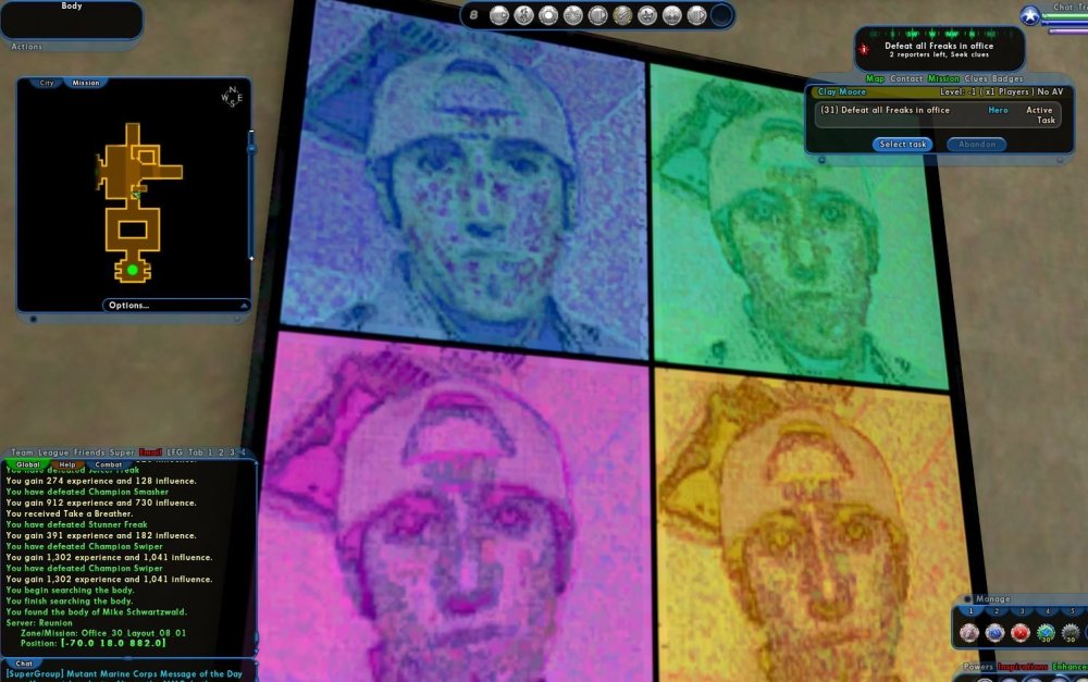 Have always seen this piece of wall art and thought this must be a photoshop mod of a Dev, Player or CoH Staff Selfie. Anyone ever heard anything? It is way more Photo realistic than anything else in the game and have always been curious if there is a story behind it.
