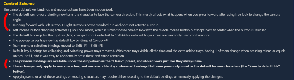 This really should have been implemented the other way around, keeping classic COH bindings as default and having those wanting a "modernized" UI actively select for it. Regardless, reverting the UI change to classic as described does not seem to work for me. Maybe it works if you've not altered the standard keybinds.txt, but I cannot get my old customized mouse/look keybinds to work. The Classic dropdown doesn't seem to change things back to my old default keybinds.txt settings. In fact, it doesn't seem to do much at all. I can go in try to manually bind my mouse/look settings, but they don't seem to hold. They don't stay persistent. I either lose +mouse_look or I lose +camrotate or I lose mouse steering. And then things seem to revert back to the new modern after a few minutes anyway no matter what I do. Loading the default keybind.txt file doesn't seem to help, either. Perhaps if the patch notes listed in detail what slash commands Page 7 had changed and what changes are necessary to revert to classic it might help me fix my problem. FWI, my customized classic bind settings (from my keybinds.txt file) that seem to conflict with the new changes: MBUTTON "target_enemy_near" RBUTTON "+mouse_look" MouseChord "+camrotate" X "camreset" Y "++autorun" Z "+camrotate" (yes, I have two +camrotate options for reasons etc.)