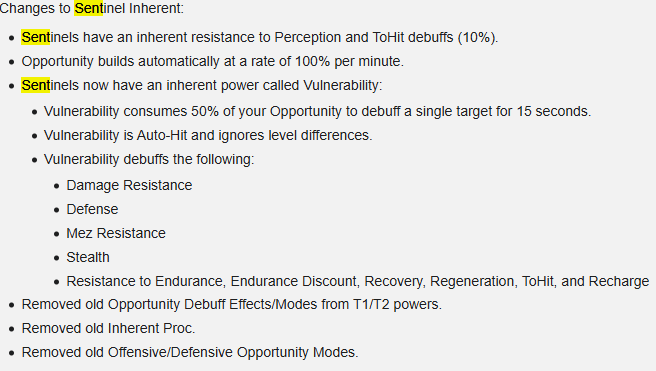 IIRC - zero cast time and it ignores level --> (one of the few, if not only power to do so). It has the same effect on a +0 as a +4.. That it what I recall as the reasoning in the patch notes and the discussion of changes at the time. [feel free to correct] -- [edit to add what I found] I could not find the original patch notes on this forum for some reason. May be having to do with all the server issues lately, otherwise I'd cite the source. Link: https://homecoming.wiki/wiki/Issue_27_Page_5#Sentinel_Archetype_Revamp Unless that's changed (I haven't seen any change), Vulnerability is super powerful.