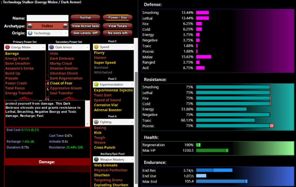 @hobbes Um I don't know the protocol here for double posting.... maybe I should edit my original post? Can a GM do merger thingy? anyway @Hobbes So I went for it. I hadn't actually tried EM since the changes, so it was an extremely pleasant surprise. bouncing around 1 shotting enemies is pretty darn fun. 1. Doesn't keep the enemies perma-stunned, the disorient tick is slow but noticeable. 2. disorients on energy melee are effective but between the procs & crits they are almost unnecessary (i went stalker) 3. Dark armor is very sturdy in almost all areas except energy resistance which means being a little squishier end game. 4. Although I'm slotted for mag 4 kb resistance I still find myself being bounced about on occasion. ymmv 5. Endurance costs are notorious for DA i managed by reducing the amount of toggles being run in combat. Overall, I would consider this experiment a success. The character is very fun to play. It has a variety of tricks to keep things interesting and increase survivability. Some sets are very powerful but boring, This is not one of those. Thank you!