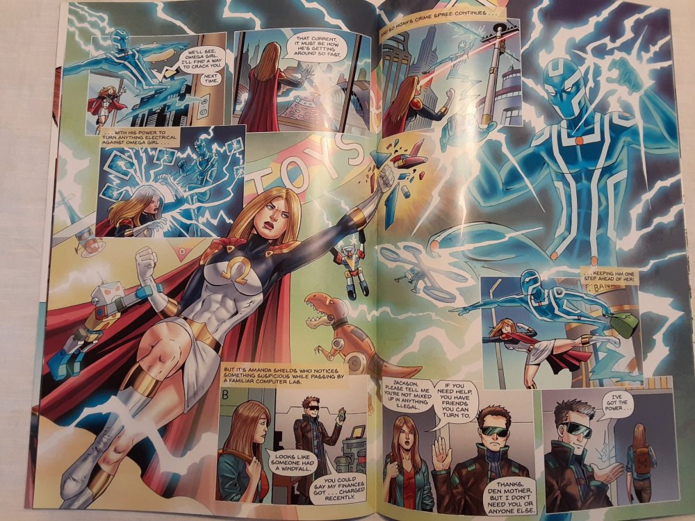 I've got some hard copies in from Indyplanet! This is the double-page spread from the comic! Omega Girl faces off with the villainous Hijak! Get yourself a copy to find out what happens next!