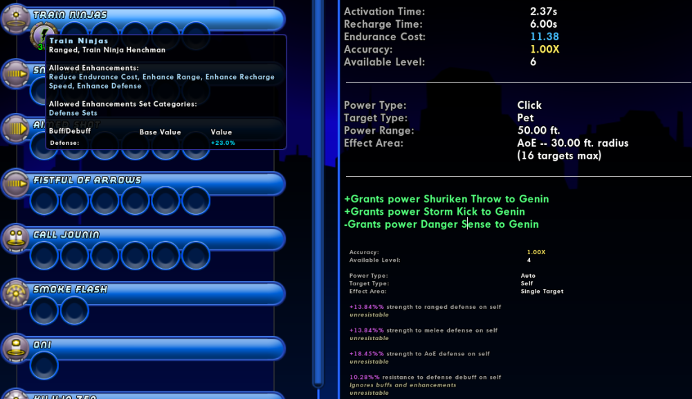 There's definitely something strange going on then. Just came back to the game and decided to see if anything had changed. The values shown on the enhancement screen appear correct: But when I inspect the combat attributes for Genin buffed with Train Ninjas using that same slotting, it's just showing the base values rather than the enhanced: So unless I'm missing something obvious, it certainly appears to be bugged for my MM at least.