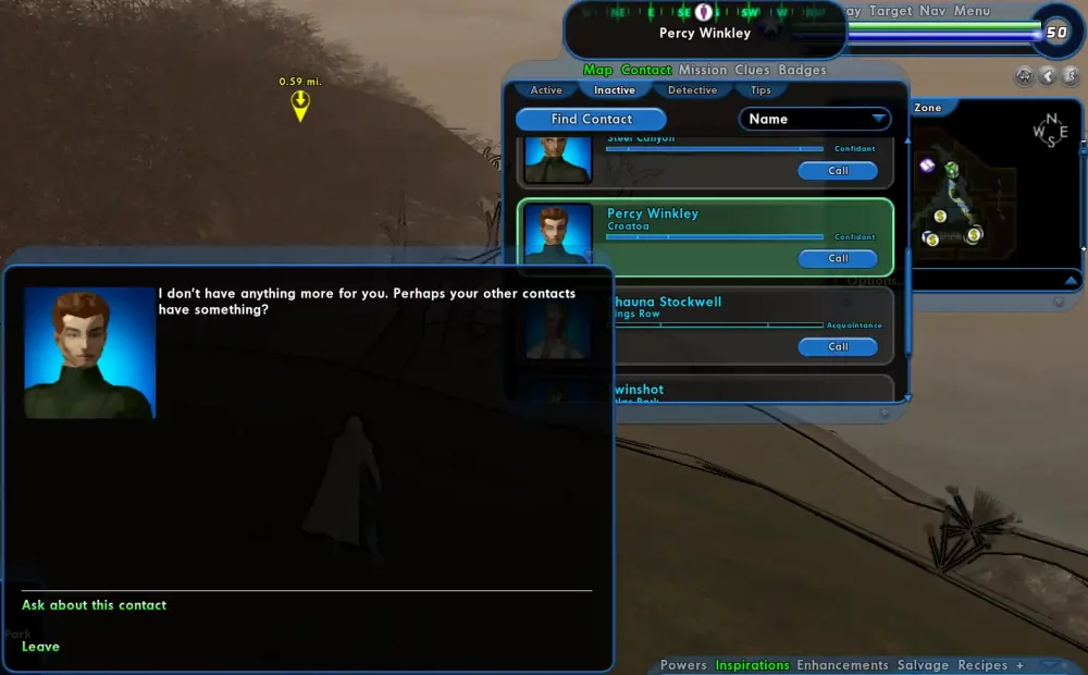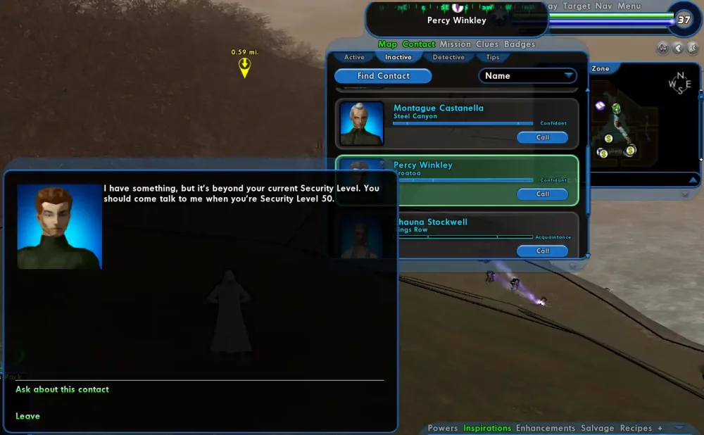 The contact definition for Percy Winkley (35-50) includes introductions to Cadao Kestrel (35-39), Madeleine Casey (40-45), or Harvey Maylor (46-50) when complete. Percy never introduces any of these contacts, though. Instead, Percy says to come back at level 50 for an introduction. Then, at level 50, he still doesn't introduce a contact. This bug is present in COH-VM3-i26 (2019), and I vaguely remember it happening before 2012 as well. Possible fix: Percy's redside counterpart, Ashley McKnight (14-50), also has a max level of 50. She has Cap Au Diable contacts as friend/peer introductions, and that works as expected. Changing Percy's introductions to be friend/peer introductions instead of complete/next introductions may fix him. Workaround for players: If your blueside magic contact chain (Cadao Kestrel, Madeleine Casey, Harvey Maylor) is broken by Percy Winkley as a dead-end contact, you can resume the chain by getting a friend/peer introduction from a contact in the blueside mut/nat/sci/tech chains.