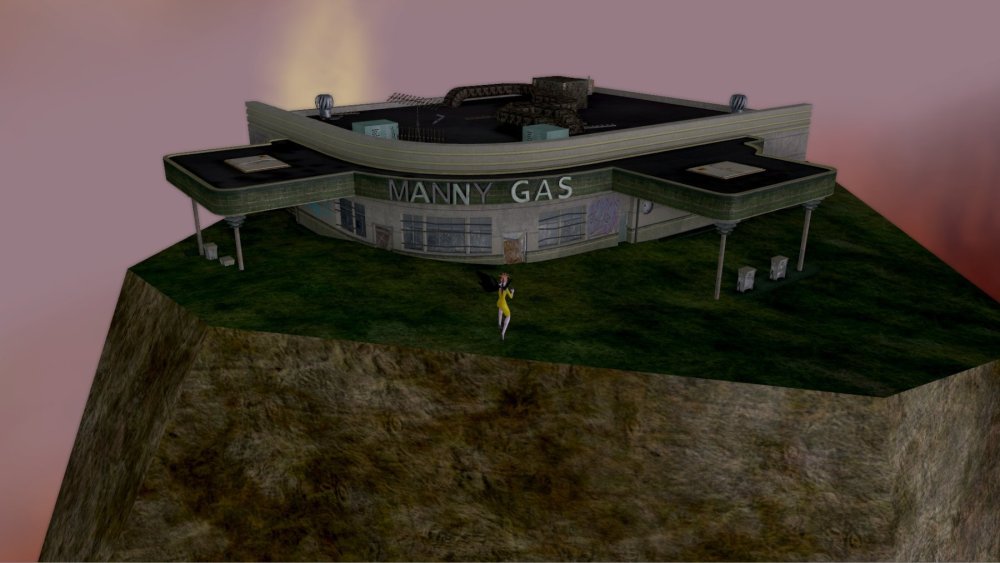 8. Go through the hole in the Tiki Bar roof, between the wall and the rocks, down then left through the missing floor section in the back corner, and the gas station is at your 10 o'clock. There's also a fun alternative-layout Rikti Mothership out there (along with one matching the MSR / RWZ design). All that being said, I have no idea how you are supposed to get your car or truck here... Maybe just bring cans.