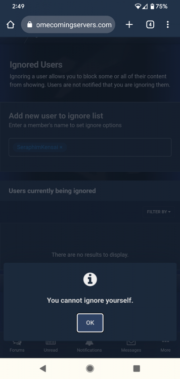So I got curious and tried to add myself to ignore... It didn't work out, I guess I'm just too powerful to ignore.