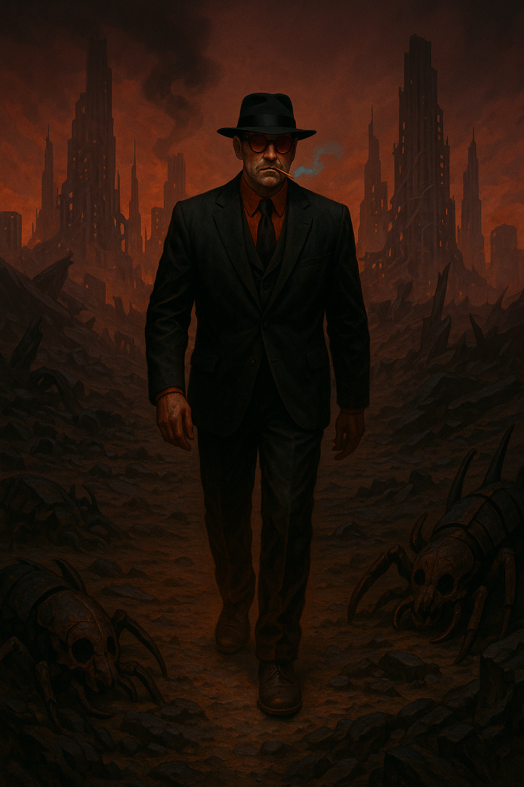 "I seen'im" Said Skittlecats as she perched on the stool, holding the bar down in Mercy Island's worst dive. "Or, I heard him." She sipped from a brass goblet. "I was doin' a burgle and just as I was about to lift the window I heard the clicks." Girstlefist leaned close and asked "Did you's smell da smoke?" He laid an enormous, pulsating hand on the bar. "Yea, but only after I waited, just a second, and then I was gone." "He did not chase?" "No." She sipped again and stared into the her drink for a moment. "And I did not burgle." ******** Scott was a drug addict. He hid, mostly in Skyway city amongst the warehouses, picking up discarded Superadine syringes. He slept behind dumpsters, scavenged through garbage for food, but mostly he just tried to hustle to make to the next day. It just so happened that today he hadn't found enough syringes, which left him no other option than to try to rob a Troll. The plan went swimmingly until Scott began to execute it. He crept out from behind the boxes at the entrance to the alley and immediately stumbled into the firelight of the burn barrel and four Trolls turned to look, failing to notice the figure emerging from the barrel fire between them. "Wellity... what have we here?" Ten eyes focused on The Man in Black as he straightened, puffing his cigar. The sickly, sweet blue smoke coiled around his fedora like a halo. He took the cigar from his mouth with two fingers and smoothed down the front of his suit jacket. Flat black, burnt orange pin-stripes. Shoes to match. Scott scarpered. Days later he would attend a meeting for recovering addicts. ********* Janice Danvers ran for her life. between the rows of cars in the parking garage, south of the metro in Independence Island. He heart clicked in her ears as she fled from the Tsoo. They were impossibly fast as closed the distance quickly. Janice's heart continued to click, louder and louder as she raced down the slope, bearing left. She exited out onto level one of the garage to a cloud of blue cigar smoke. She coughed and waved her hand in front of her face as she desperately cast about before spying the exit. She had a chance to take six sprinting steps before being knocked to the ground. "Keep goin', lass." Said a voice, crackling with power. The heat was intense, but not enough to stop Janice from getting to her feet and running away from the wall of fire that now blocked passage to the ground floor. She resumed her escape, sprinting out into the street as sirens rose in the distance. She would later tell a story of how Hell itself opened up behind her, saving her life. ******** Eugene Evans lost his keys again. They were just there, on his desk. He checked his wastepaper basket, but no. He rifled through his drawers, but found nothing amongst the long abandoned notes, paperclips and sick leave forms. He slumped back in his little chair and stared at the drop ceiling, basking in the fluorescent lighting. He only just noticed the barrel of the Beretta in his peripheral vision. The Malta agent was particularly large and particularly calm. He flicked the barrel of the gun upwards and Eugene stood. The agent pressed a finger to his ear before holstering his weapon and brining out a zip-tie. He pushed Eugene's shoulder, spinning him around before slamming him up against the far wall of the office. "You're coming with me." The agent breathed into his ear. They walked the length of the hallway, Eugene in front, the agent in the back holding up middle of the zip-ties to keep his hostage moving. They rounded the corner towards the elevator and pressed the call button. The elevator ride down was awkward as "The Spanish Flea" played. It was one of Eugene's favourites. The elevator dinged and the doors opened to carnage and the smell of cooking meat, a smell that was only overcome by the cigar smoke that hung heavy and blue in the air. A man stood in the centre of the lobby surrounded by dead Malta agents, smoking said cigar, the new, fat coils from which encircled his black fedora like a halo. His flat black, three-piece suit hung on him like a mourning cloak as he puffed his cigar and stared into Eugene Evans' soul from behind opaque, burnt orange lenses. The Bio-Energy Feedback Inducer hit the floor first, followed by the jet-pack and the Beretta that had been held to Eugene's head, shortly after he had realized he lost his keys. The Man in Black took the cigar from the corner of his mouth with the first two fingers of his left hand and blew a final plume into the air as sirens sang in the distance. He was gone by the time PCPD arrived, but both Eugene and the agent held still not daring to move until they could no longer smell that cigar.