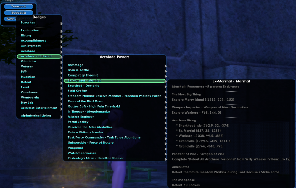 Hey everyone, with the rise in popularity of the pop up menu (or "pup menu" as I call it), we were bound to get some interesting options. I am proud to introduce to you to the transportation and badge tracker. Inside, you'll find: Public Super Group Access - Every publicly listed Supergroup on every Shard of the Homecoming Server Achievement Badges - Every badge in the game, not just accolades. Teleportation - Player and team teleport, mission teleport, and even incarnate teleport (subject to acquiring the respective powers in-game) My friend Eclipse did most of the work. I just helped out and got in the way sometimes 🙂 Acknowledgements: // POPMENU file for BadgeSetList // Version 20200307.01 // Original BadgeList menu created by Janrith and updated by ROBOKiTTY // Original Settitle menu created by Wingman // BadgeSetList built upon above menus and modified by AboveTheChemist // POPMENU file for Homecoming Transportation Powers & Base Codes // Original SG ListCreated And Curated By Healix: https://forums.homecomingservers.com/topic/1474-basecode-passes/ // Original Menus Created By Eclipse. and updated by Vayek // Version 20200328.01 Transportation & Badge Pop Menu.7z