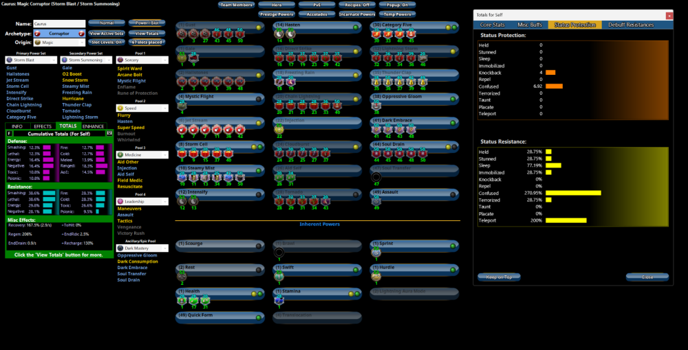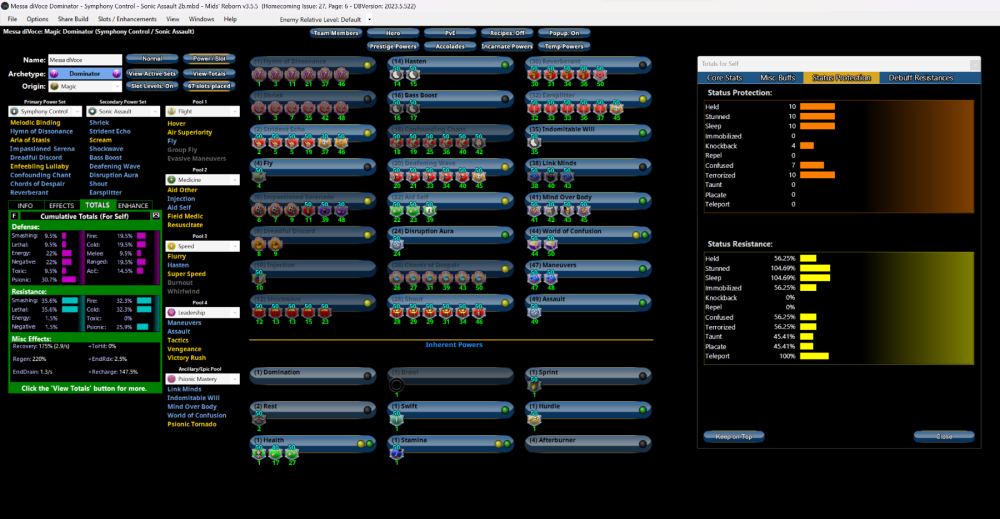 Hey folks, I'm trying my hand at a Mind Control/Kinetics Controller and advice is appreciated. I think the biggest room for improvement is proper slotting. Thoughts? Primary Power Set: Mind Control Secondary Power Set: Kinetics Power Pool: Flight Power Pool: Speed Ancillary Pool: Psionic Mastery Hero Profile: ------------ Level 1: Levitate Acc(A), Dmg(5), Acc(11), Dmg(40), Dmg(42) Level 1: Transfusion Acc(A), Acc(3), RechRdx(7), EndMod(9), Heal(43) Level 2: Dominate Acc(A), Hold(3), Acc(7), Hold(31) Level 4: Siphon Power Acc(A), RechRdx(5) Level 6: Confuse Acc(A), Conf(9), Acc(15), Conf(31) Level 8: Fly Flight(A), Flight(17) Level 10: Siphon Speed Acc(A), RechRdx(11), Acc(13), RechRdx(13) Level 12: Mass Hypnosis Acc(A), Sleep(23), Acc(23) Level 14: Hasten RechRdx(A), RechRdx(15) Level 16: Increase Density ResDam(A), ResDam(17), RechRdx(37) Level 18: Total Domination Acc(A), Hold(19), Acc(19), RechRdx(21), Acc(21) Level 20: Super Speed Run(A) Level 22: Speed Boost EndMod(A), RechRdx(29), EndMod(34) Level 24: Telekinesis EndRdx(A), EndRdx(25), EndRdx(25) Level 26: Terrify Acc(A), Fear(27), Acc(27), Fear(40), RechRdx(46) Level 28: Inertial Reduction Jump(A), Jump(29) Level 30: Burnout RechRdx(A), RechRdx(31) Level 32: Mass Confusion Acc(A), Conf(33), Acc(33), RechRdx(33), Acc(34), Conf(34) Level 35: Transference Acc(A), RechRdx(36), Acc(36), EndMod(36), EndMod(37), Acc(37) Level 38: Fulcrum Shift Acc(A), RechRdx(39), Acc(39), RechRdx(39), Range(40) Level 41: Mental Blast Acc(A), Dmg(42), Acc(42), Dmg(43), Dmg(43) Level 44: Indomitable Will RechRdx(A), DefBuff(45), RechRdx(45), DefBuff(45), RechRdx(46), DefBuff(46) Level 47: Mind Over Body RechRdx(A), ResDam(48), RechRdx(48), ResDam(48) Level 49: World of Confusion Acc(A), Conf(50), Acc(50), RechRdx(50) Level 1: Brawl Empty(A) Level 1: Containment Level 1: Prestige Power Dash Empty(A) Level 1: Prestige Power Slide Empty(A) Level 1: Prestige Power Quick Empty(A) Level 1: Prestige Power Rush Empty(A) Level 1: Prestige Power Surge Empty(A) Level 1: Sprint Empty(A) Level 2: Rest Empty(A) Level 4: Ninja Run Level 2: Swift Empty(A) Level 2: Health Empty(A) Level 2: Hurdle Empty(A) Level 2: Stamina Empty(A) ------------