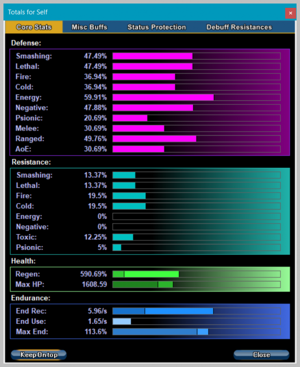 Hello team! Wanted to share some of my builds in case folks are looking for similar ideas. This one is for a Fire/Dev that is my favorite toon, Los Infiernos (Excelsior server). TOON BASICS Hover blaster 45% SLENR with 30-35% FCMA Mez protection & resistance A feeling of "tankiness" and "sneakiness" when hopping in for Inferno Outrageous Accuracy/ToHit No Pets. No bombs. Where we're going, we don't need ... roads pets. ATTACK CHAINS Alpha: Smoke Grenade > Aim > Inferno or Judgment > Fireball > Caltrops (optional) > ST Damage & Fireball Beta: Smoke Grenade >Caltrops (underneath me) > Fireball & ST AVs: Same stuff, but also use Toxic Web Grenade and Envenomed Dagger SNEAKY BAHSTAHD Mission Clicking: Field Operative + Smoke Grenade = no one gonna see me click stuff right in front of them 😄 Except Rikti Drones and a few others ... much respect to them MEZ PROTECTION & RESISTANCE Generally, this guy can handle some adversity, even without Defiant Barrage +Status, Clarion, and Melee Core: Alternate Clarion & Melee Core, bolster with BFs and Fireball as needed Hold +2 (gotta hit me twice ... GL with that) Stun/Sleep/Fear are key weaknesses, mostly Stun Immob +8.3 KB Prot +17 (above the KB for Nemesis staff) Confuse +3.63 DEBUFF RESISTANCE Perception 96% - nobody can out-Smoke Grenade me 😄 ToHit Debuff 55% - Can hit Carnies even through a couple layers of Master Ill's Fluffy (Chill of the Night) Recharge/Speed 45% - I am hard to slow down FIRE BLAST Fireball - Superior Defiant Barrage (6-slot for bonuses & "Status Protection" proc) Aim - Inferno's best friend Fire Blast / Blaze / Blazing Bolt - ST attack chain (sprinkle in Fireball and the party is nonstop) Inferno - why else does one "Fire Blast" ? DEVICES Toxic Web Grenade - because they make me take it and it has -Fly & Immob so hover blasting AVs got a whole lot easier Caltrops - positional control. Drop these underneath and hover above for maximum security Targeting Drone - good lord, this is OP ... 80% Damage Buff for Alpha (Inferno) Smoke Grenade - Stealthy, -Per, -THDB autohit power!? Yes please. Field Operative - imho, the most OP of the blaster survivability buffs. 15ft stealth even when clicking or attacking!!! So helpful. MACE MASTERY Scorpion Shield - Could also use Cold Mastery (Snow Storm + Frozen Armor is pretty great) POWER POOLS Fighting - You know the drill. Boxing/Tough/Weave I slotted Aegis Mez & Impervious Skin Mez protections ... really helps for -Stun/Disorient mitigation Flight - Hover/Fly/Evasive Maneuvers EM is very helpful for its -KB% and flight protection (stacks with Hover) Leaping - CJ / SJ / Acrobatics Acrobatics for the +2 Mag Hold protection. The KB stuff helps too, but the big deal is I don't get held from the first hold attempt, and my hold resistance is pretty ludicrous, so it gets hard to enemies to actually lock me down. Leadership - Maneuvers / Tactics / Vengeance Cen, bro ... why do you have Tactics + Targeting Drone + Kismet ?? Tactics = Confuse Protections ~35% ToHit Buff + THDB Resistance = all these punches are gonna land ! INCARNATE STUFF Note: These are the ones I use most of the time. Notice that not everything involves damage...gotta survive to thrive Alpha - Agility Core Paragon (Rech/Def/EndMod) Since I slotted for defense IOs, I needed a little boost in recharge - this toons cranks out ~5.9 end/sec so I can leave most of the power pool toggles on to keep mez protection/resistance at bay Judgment - Pyronic Core Final Judgment (alternate with Inferno for your partystarters) Interface - Reactive Radial Flawless (75% fire DoT, 25% -Res) There seems to be a pattern... something something fire... Lore - Storm Elemental Core Superior Ally Shadow Shard fan here, gotta stick with Lanaru's neurons Destiny - Clarion Core Epiphany MEZ PROTECTION Hybrid - Melee Radial Embodiment (Melee Core Embodiment works just fine, too!) MEZ PROTECTION Regen can hit 1000% (or 72 HP/sec) which stacks very well with defenses CENOZOIC, BRO, YOU SHOULD TAKE MY ADVICE IN THE COMMENTS SECTION Before you tell me that I need more damage or procs or recharge, how about sending me an invite on Excelsior. I promise this toon has enough horsepower. @Cenozoic This Hero build was built using Mids Reborn 3.0.5.6 https://github.com/Reborn-Team/MidsReborn Click this DataLink to open the build! Los Infiernos v1.2: Level 50 Magic Blaster Primary Power Set: Fire Blast Secondary Power Set: Devices Power Pool: Flight Power Pool: Fighting Power Pool: Leaping Power Pool: Leadership Ancillary Pool: Mace Mastery Hero Profile: Level 1: Fire Blast (A) Thunderstrike - Accuracy/Damage (3) Thunderstrike - Damage/Endurance (3) Thunderstrike - Damage/Recharge (5) Thunderstrike - Accuracy/Damage/Recharge (5) Thunderstrike - Accuracy/Damage/Endurance (7) Thunderstrike - Damage/Endurance/Recharge Level 1: Toxic Web Grenade (A) Superior Winter's Bite - Accuracy/Damage (7) Superior Winter's Bite - Damage/RechargeTime (9) Superior Winter's Bite - Accuracy/Damage/Endurance (9) Superior Winter's Bite - Accuracy/Damage/Recharge (11) Superior Winter's Bite - Damage/Endurance/Accuracy/RechargeTime (11) Superior Winter's Bite - Recharge/Chance for -Speed & -Recharge Level 2: Fire Ball (A) Superior Defiant Barrage - Accuracy/Damage (13) Superior Defiant Barrage - Damage/RechargeTime (13) Superior Defiant Barrage - Accuracy/Damage/RechargeTime (19) Superior Defiant Barrage - Accuracy/Damage/Endurance (19) Superior Defiant Barrage - Accuracy/Damage/Endurance/RechargeTime (21) Superior Defiant Barrage - RechargeTime/+Status Level 4: Caltrops (A) Artillery - Accuracy/Damage (31) Artillery - Damage/Endurance (31) Artillery - Damage/Recharge (34) Artillery - Accuracy/Damage/Recharge (37) Artillery - Accuracy/Recharge/Range (37) Artillery - Endurance/Recharge/Range Level 6: Hover (A) Luck of the Gambler - Defense/Increased Global Recharge Speed Level 8: Boxing (A) Superior Blistering Cold - Accuracy/Damage (45) Superior Blistering Cold - Damage/Endurance (46) Superi